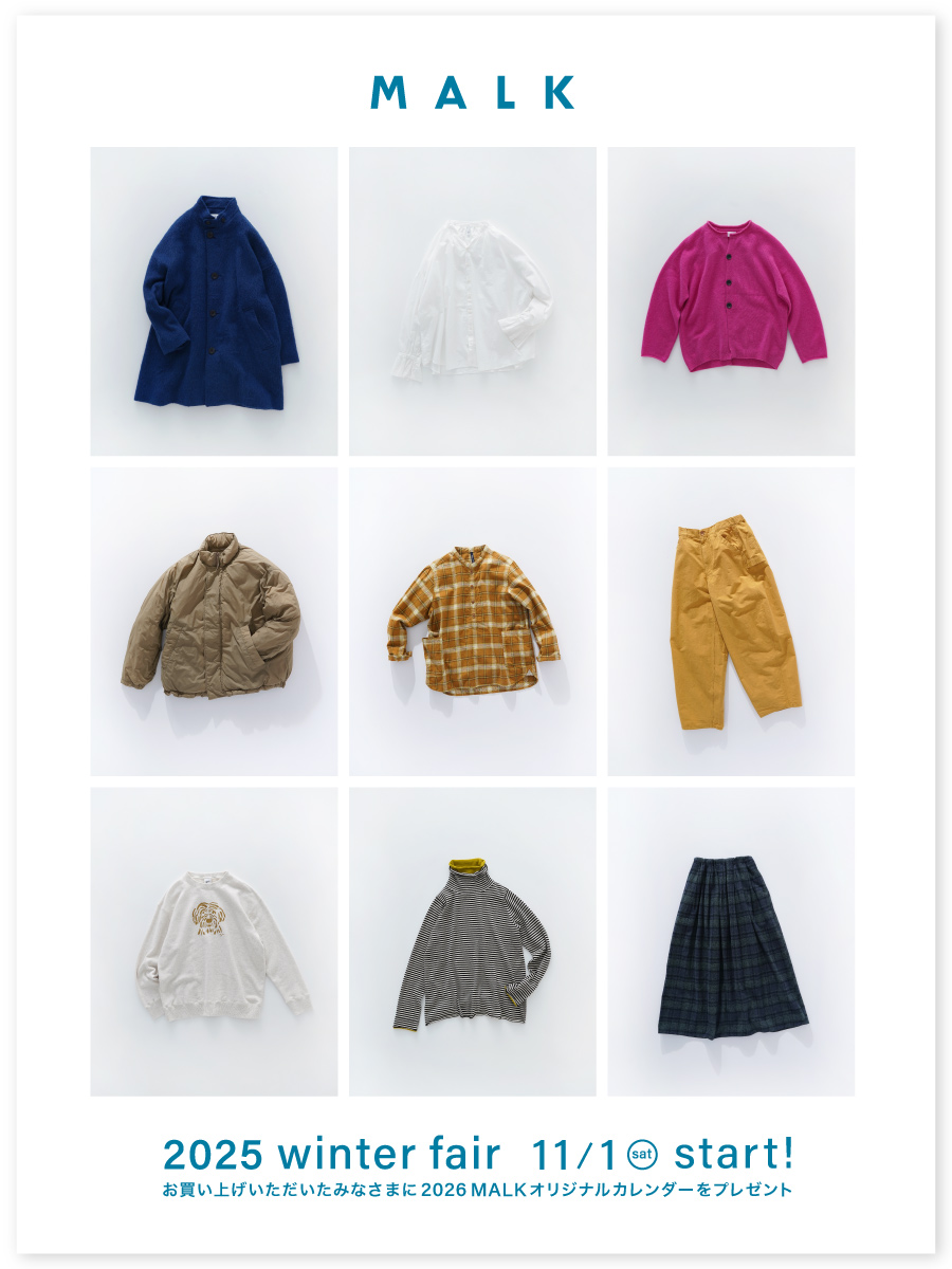 2024.11.052024 enjoy your winter clothes at MALK 開催致します! 耳を澄ますと聞こえてくる 静かに、けれど確かな冬の訪れを知らせる ひんやりとした空気を纏った 小さな…… READ MORE