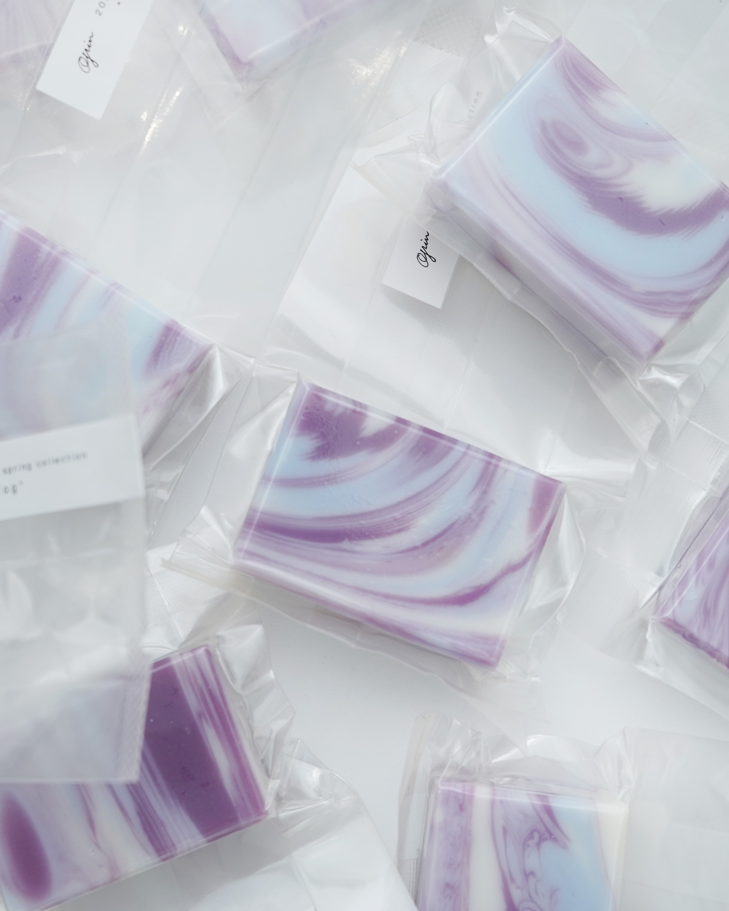 淡いパープルとシアー感のある薄いブルーの色合いが混じり合うマーブル模様。