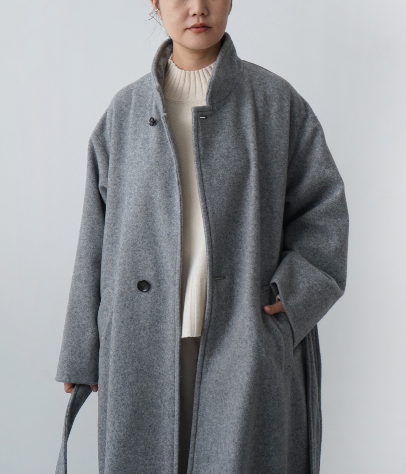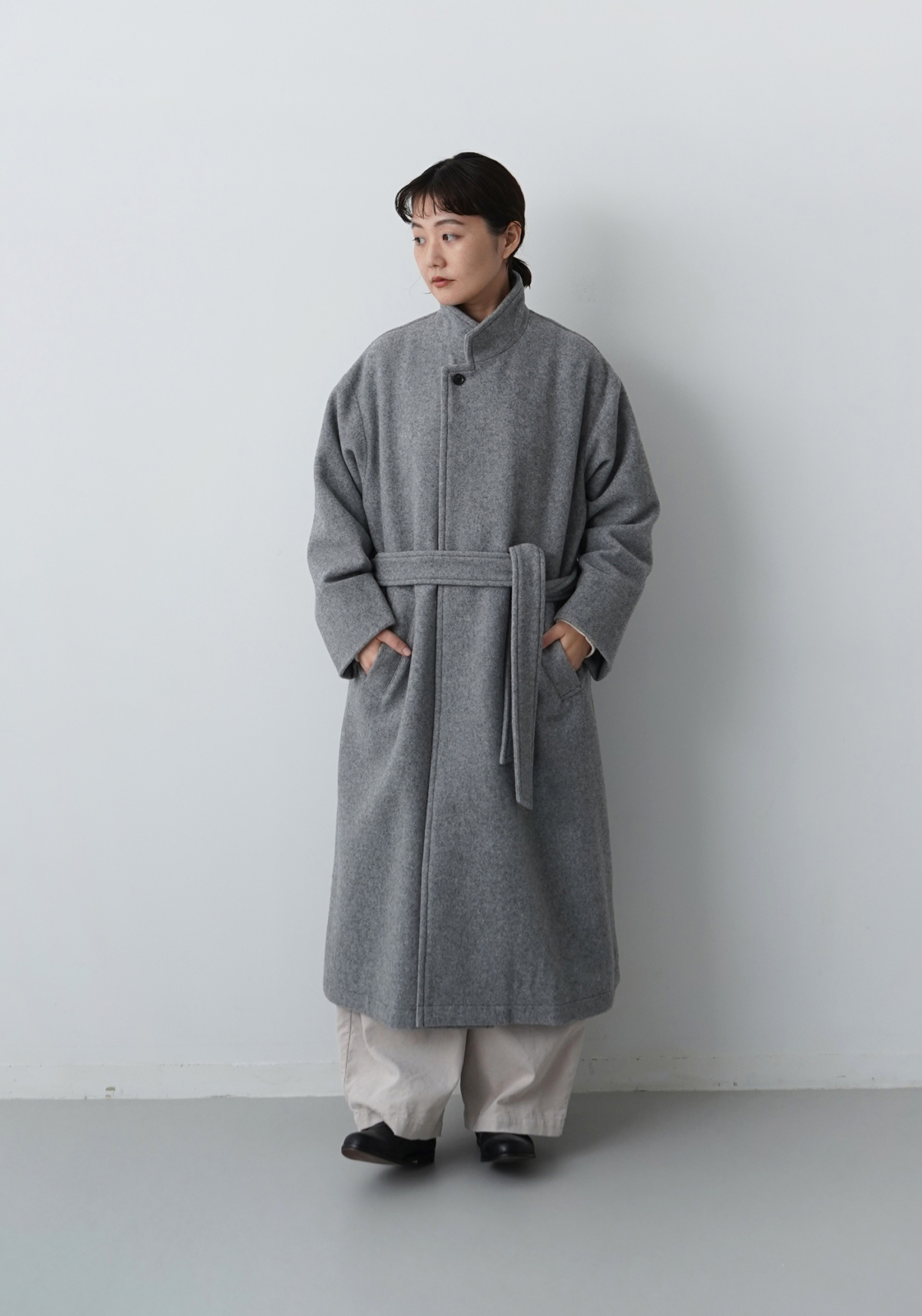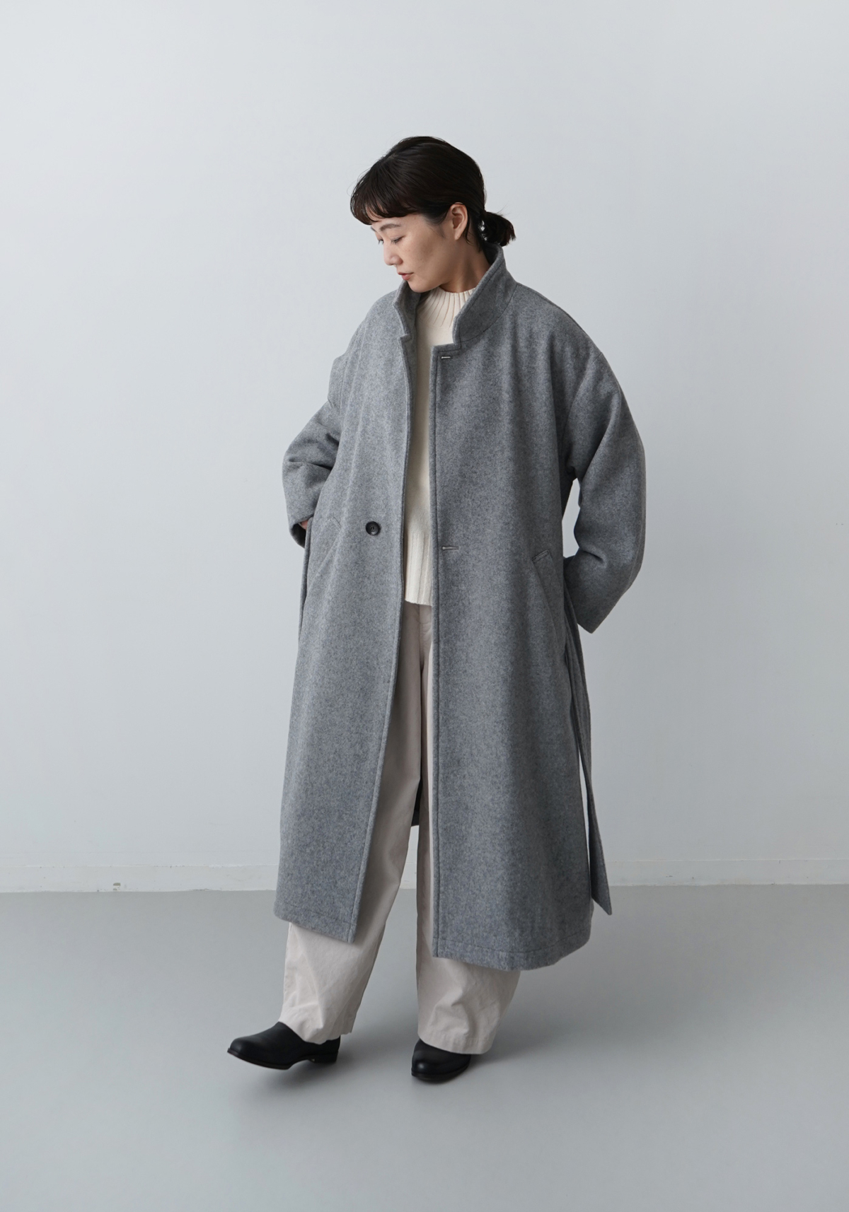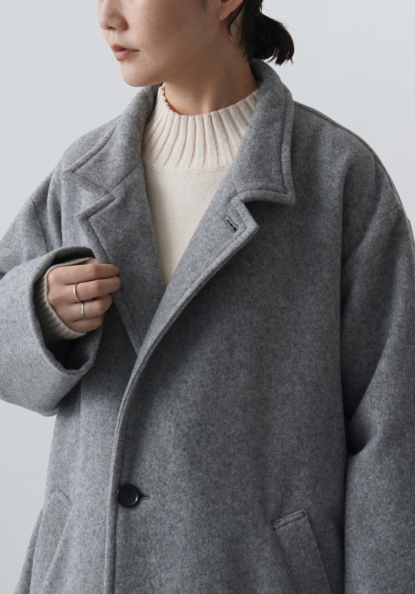 この随所に取り入れた柔らかさが直線的なロングコートとの