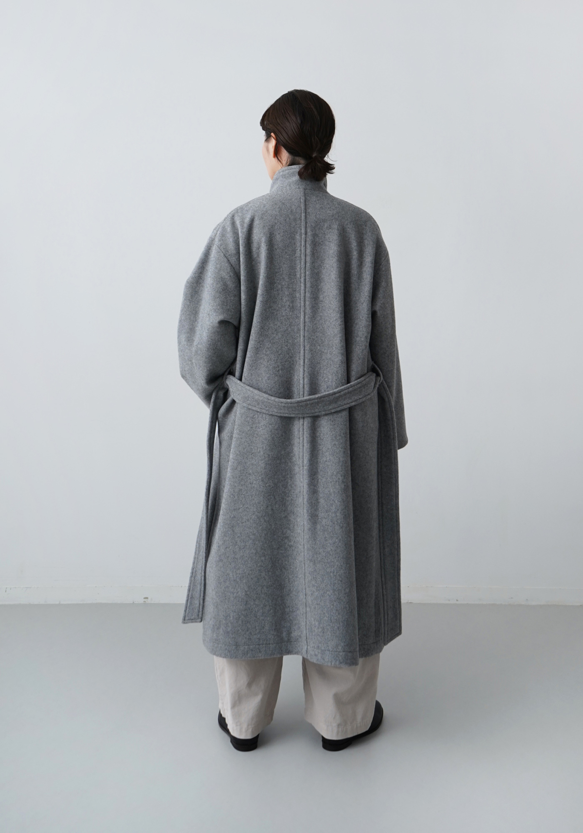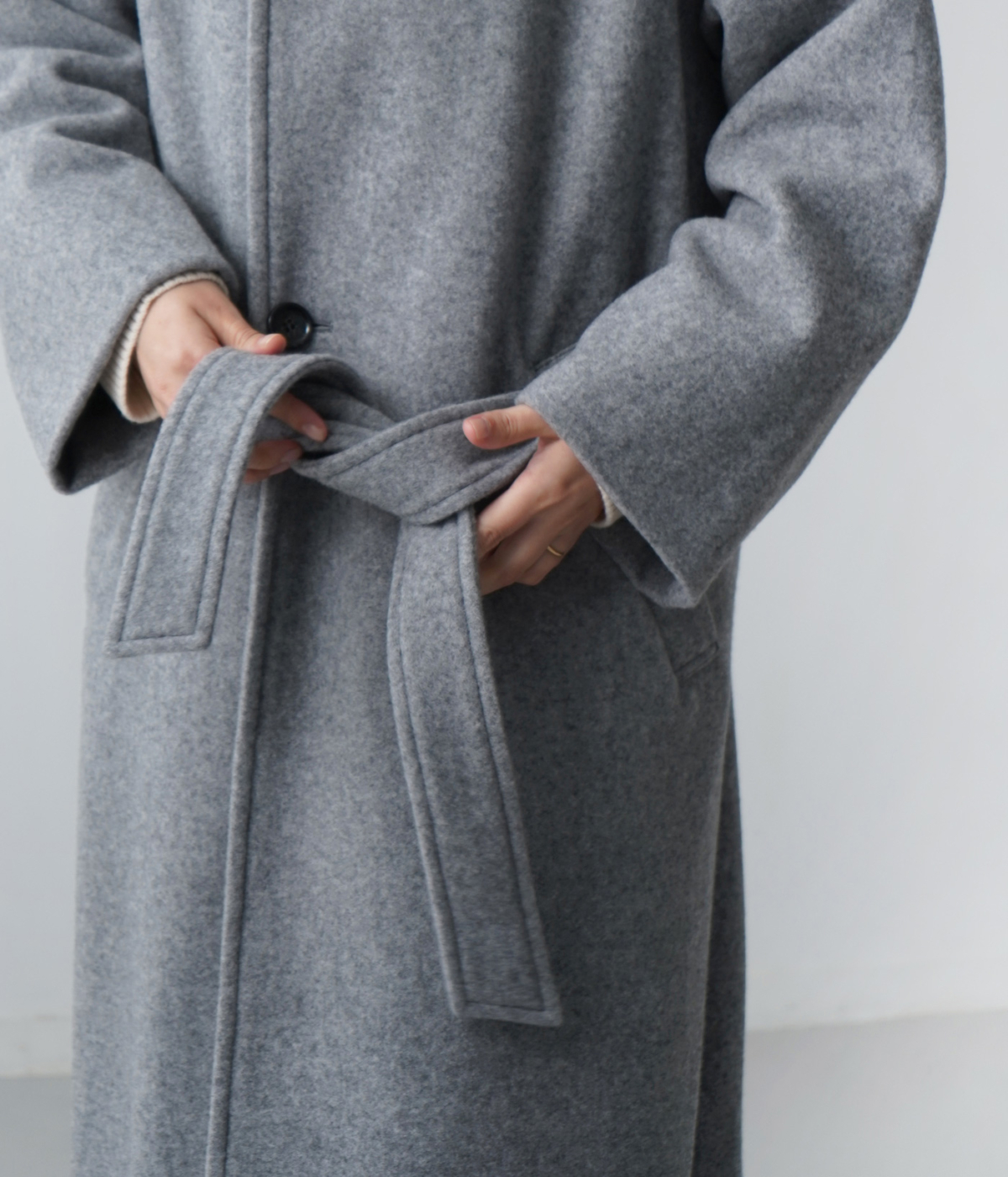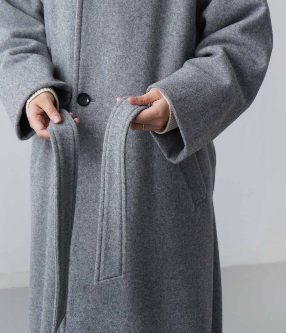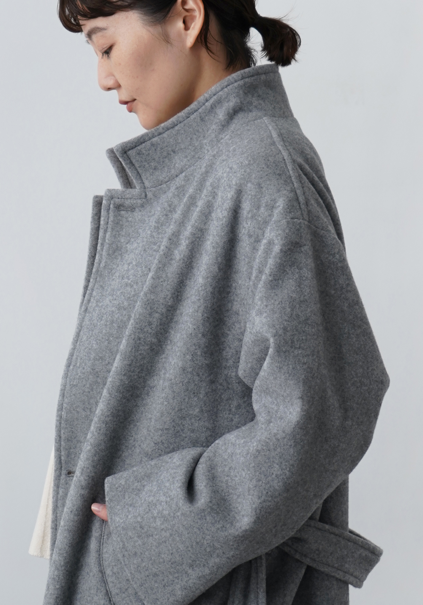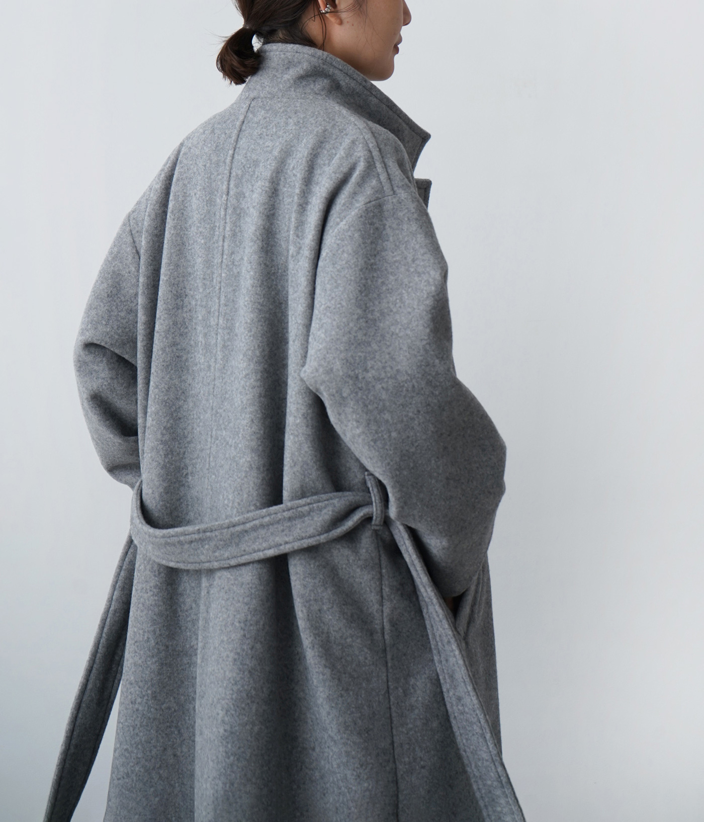 この随所に取り入れた柔らかさが直線的なロングコートとの