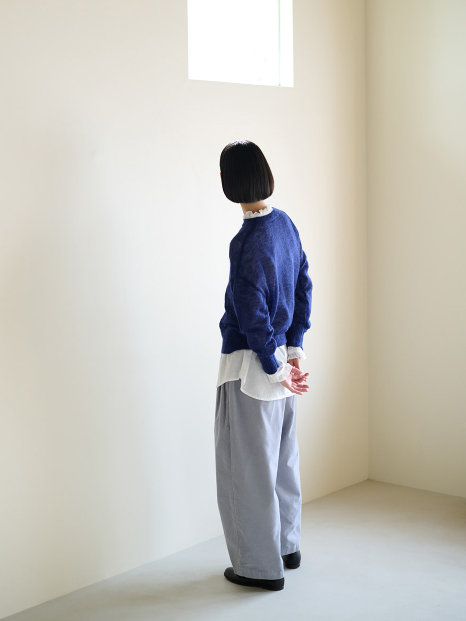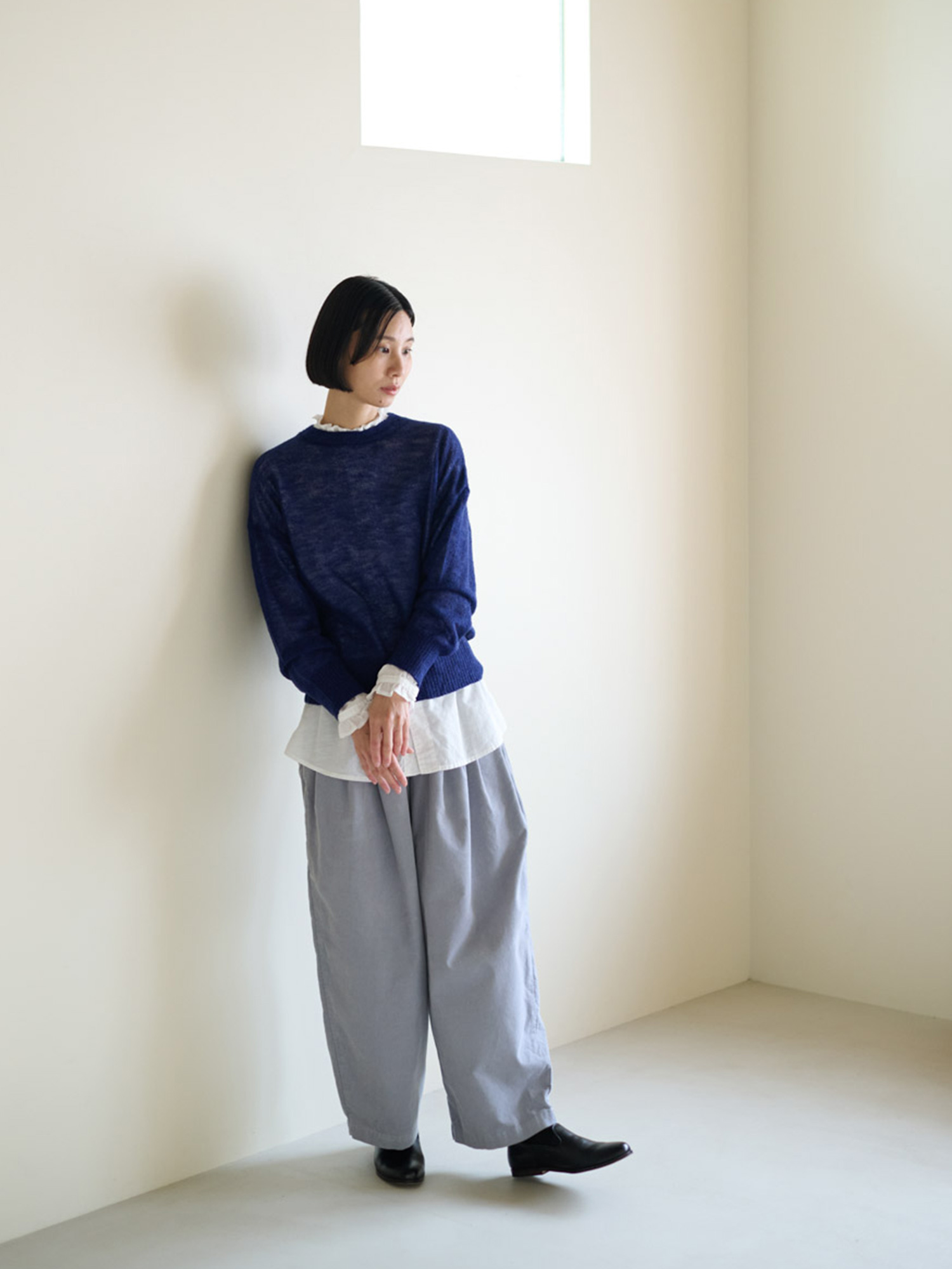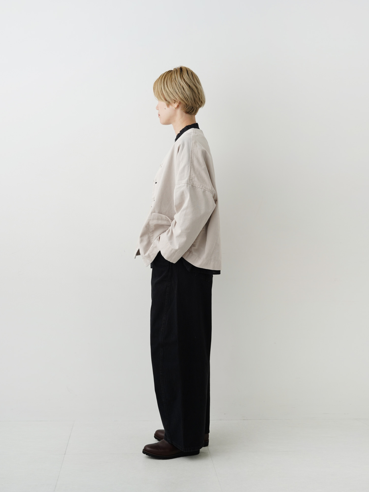 ワイドシルエットが前面に出すぎないよう すっきりとした襟元や着丈の長さが調整的な役割に。