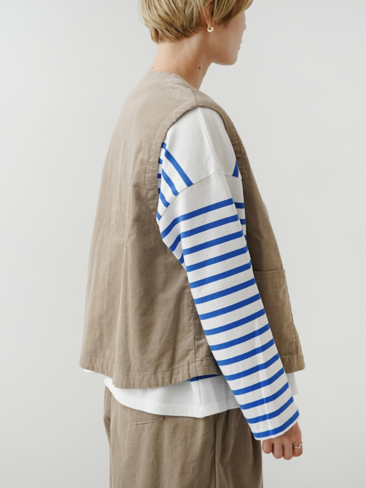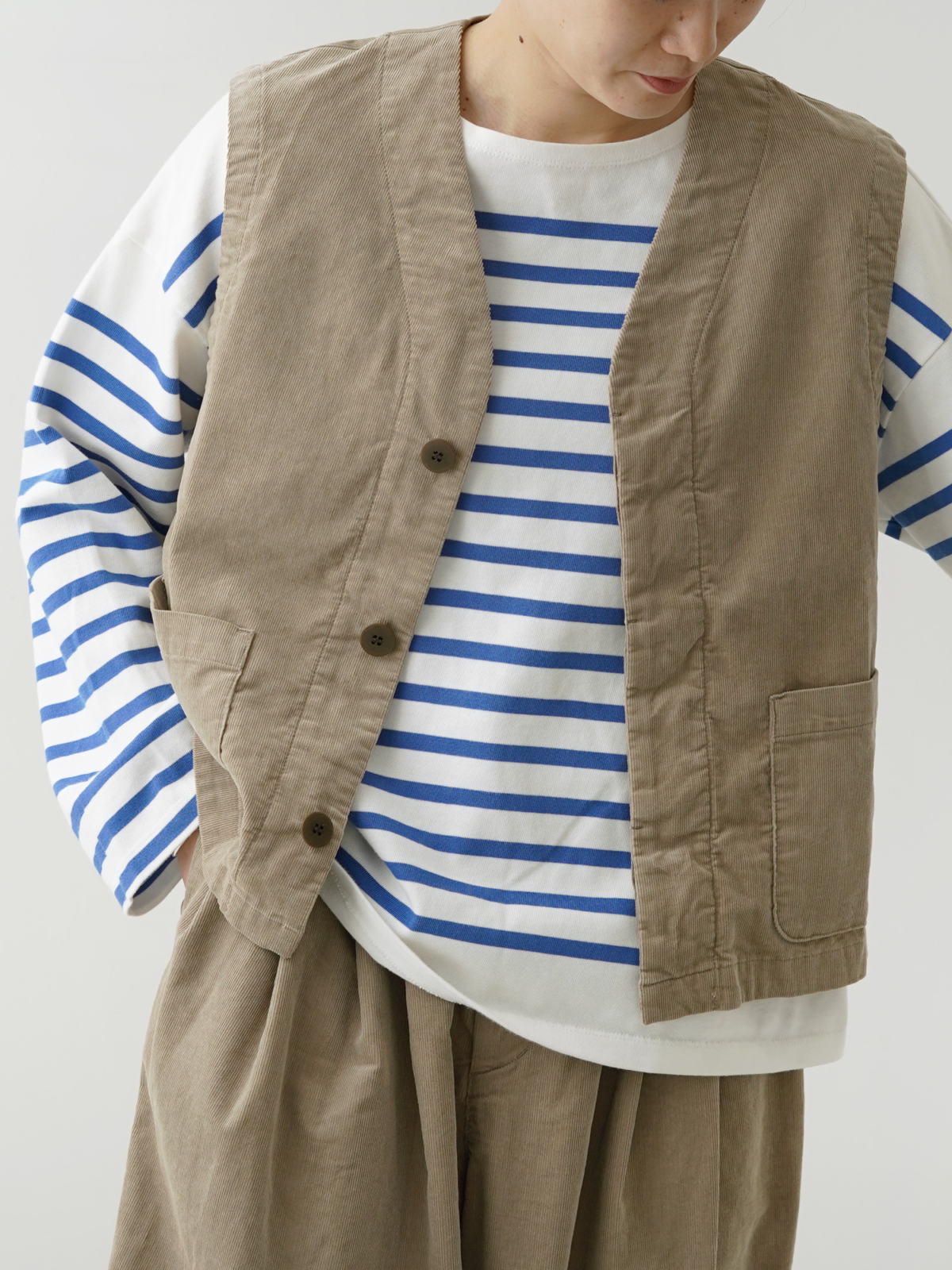 コーデュロイを用いて作ったのは、ジャケットにベスト、パンツの3型。
