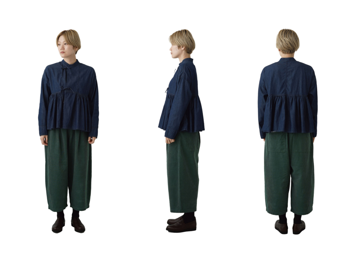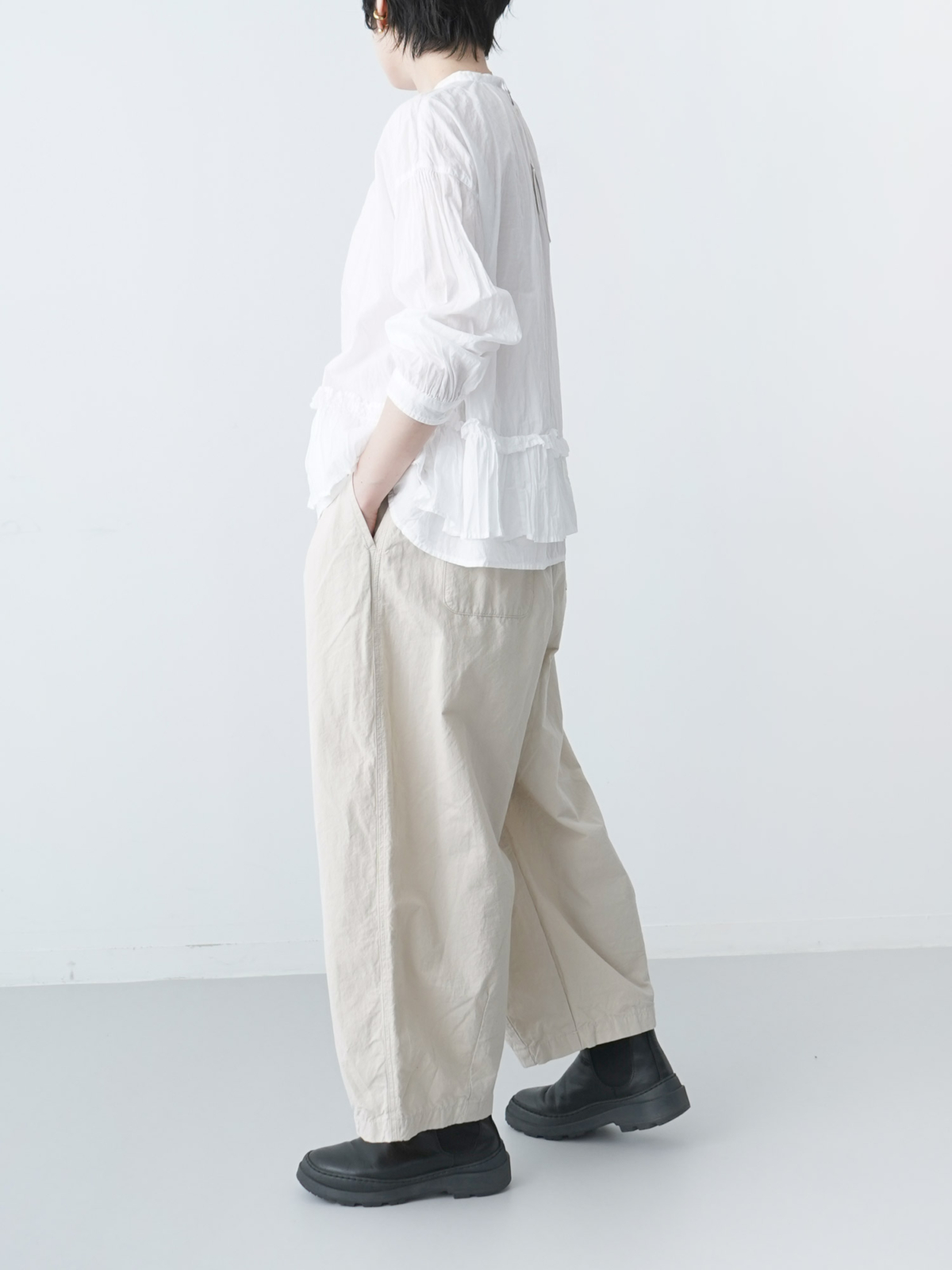 小柄な方も挑戦しやすいワイドパンツです。生地のしなやかさと、長すぎない丈によって軽やかな印象になります。横からみても膨らむことなくきれいに落ちます。太いシルエットなので、トップスはコンパクトが良いのかな?とバランスに少し悩む方には「そんな事ないよ!」と一押ししたくなる様な一点です。ルーズなニットに合わせたり、今回コーディネートをしたgrinの着丈長めのブラウスとも相性抜群で、おすすめのバランスです。大人っぽくまとめたい時ほどゆるりとしたトップスと◎レザーシューズとの組み合わせも大人な雰囲気が増して素敵です。