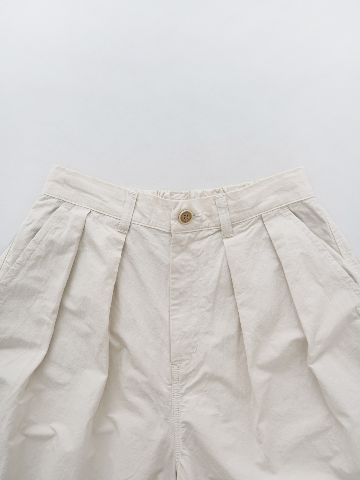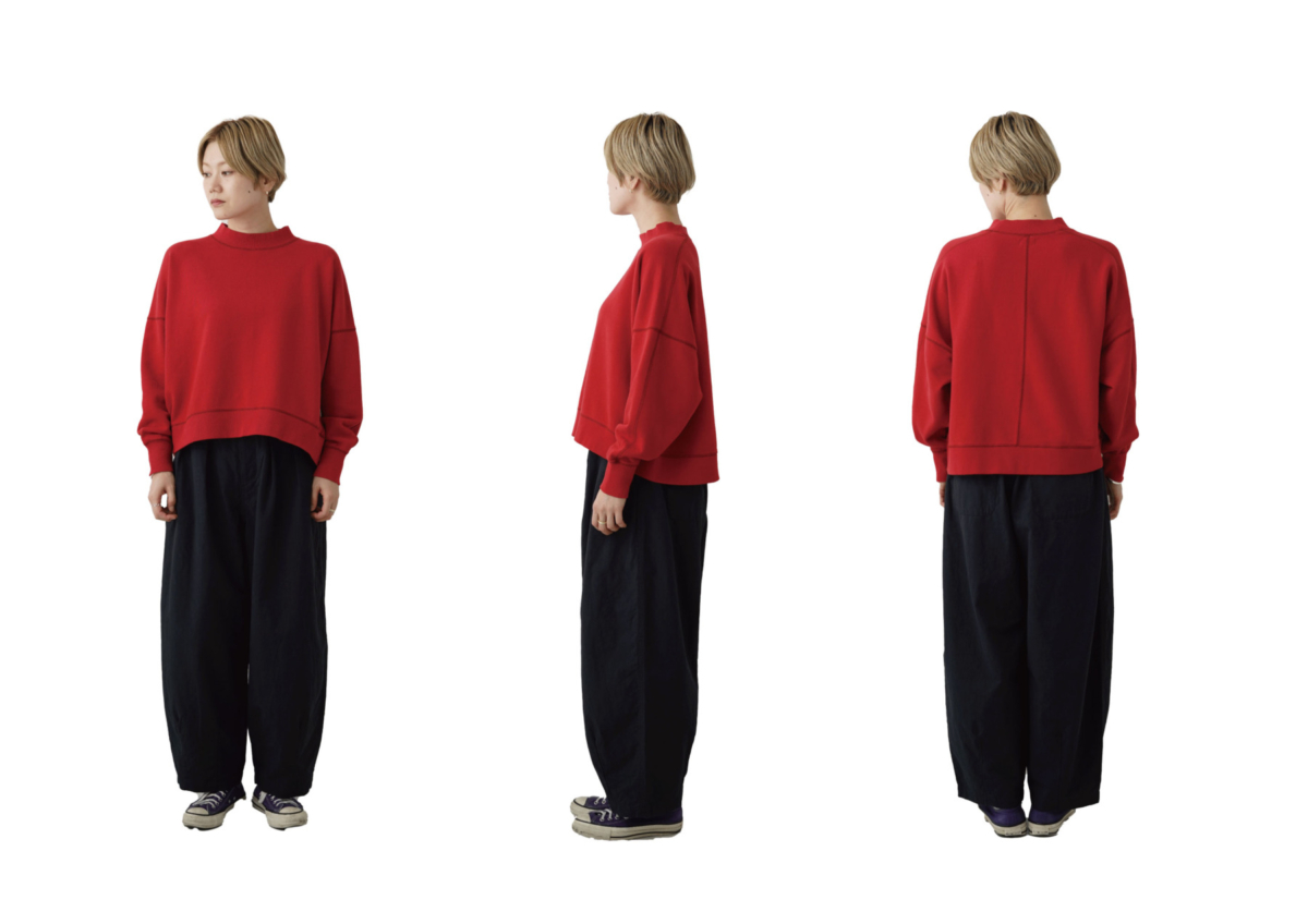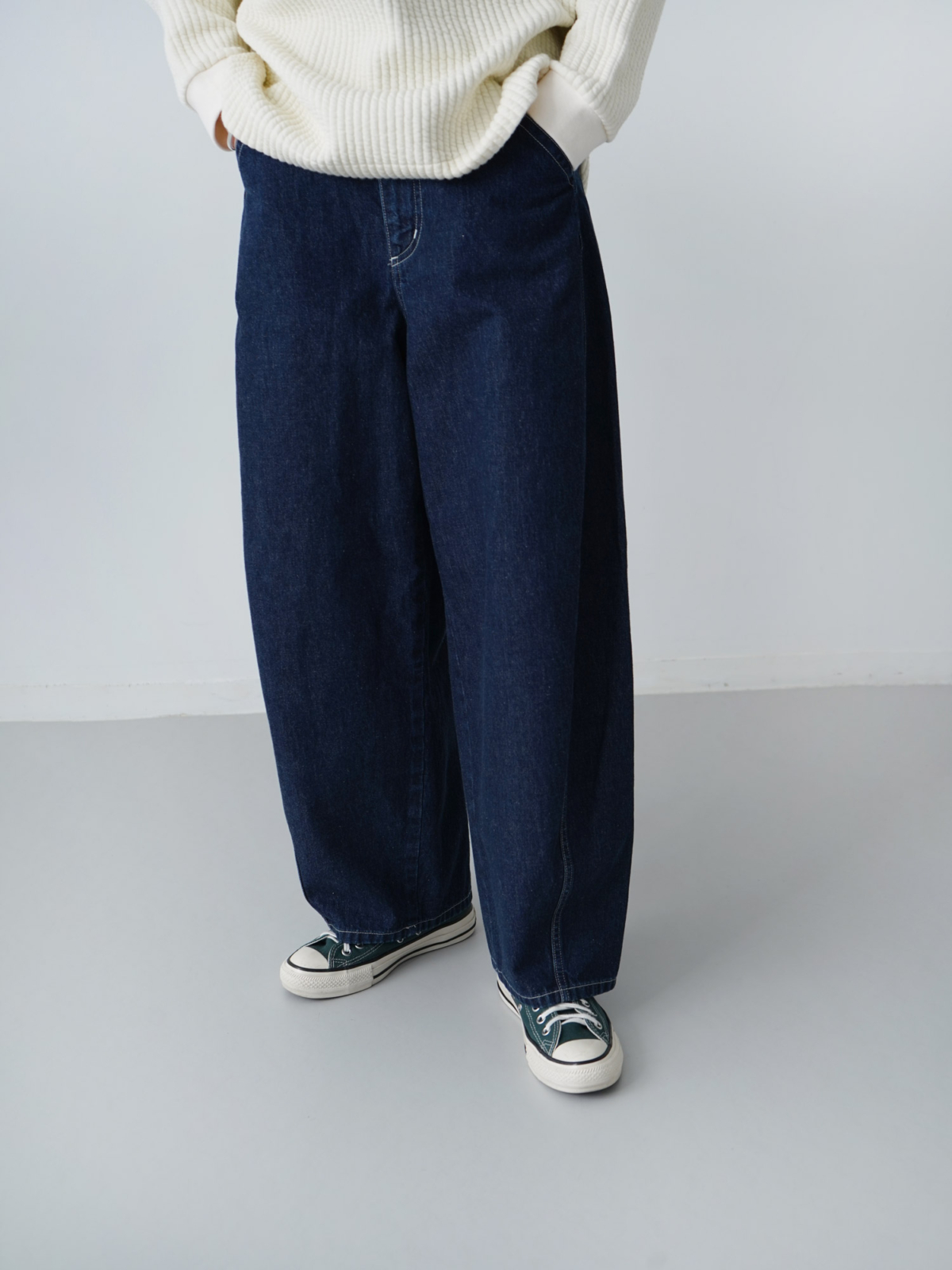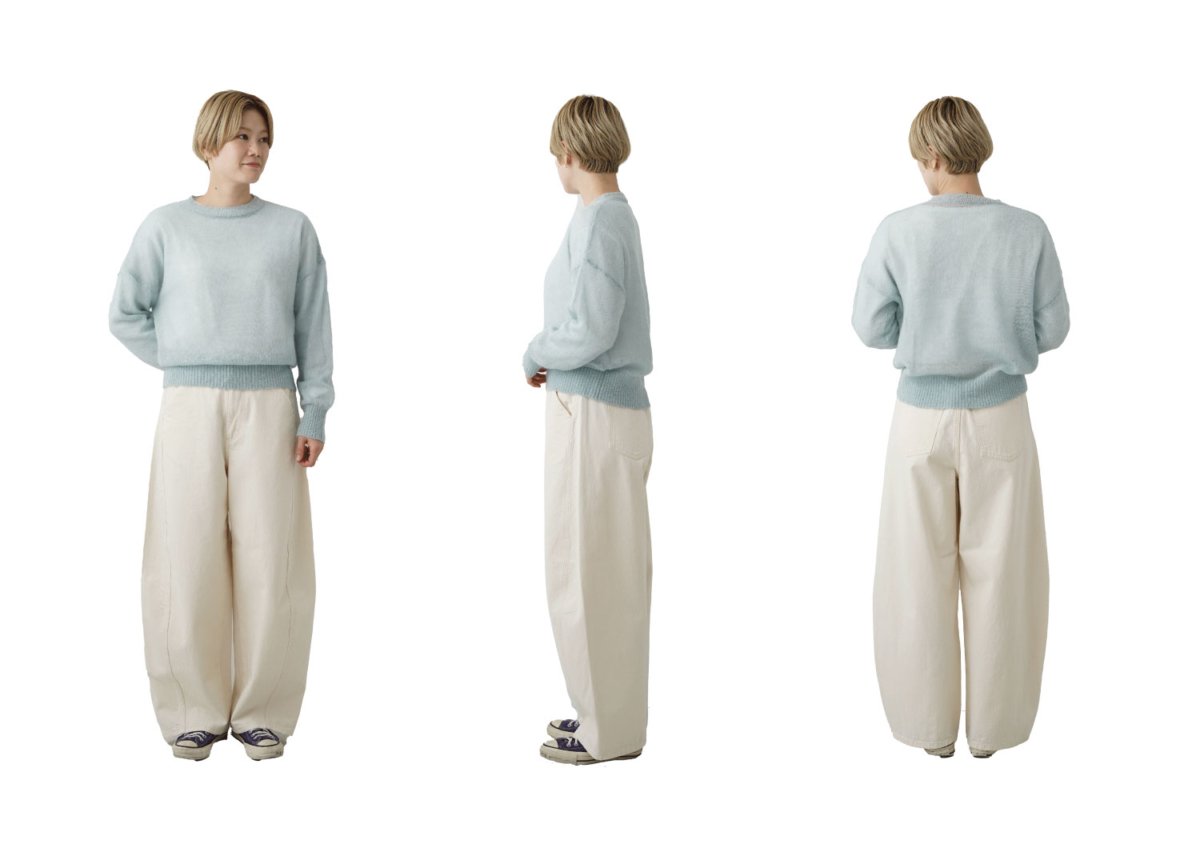 今回紹介するボトムの中で一番短い丈です。ワイドシルエットで裾に向かってほんのりカーブした形です。ワイドエッグパンツと名前の通り、ほんのり丸みがあります。