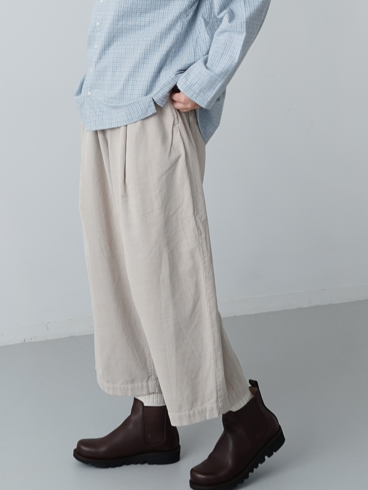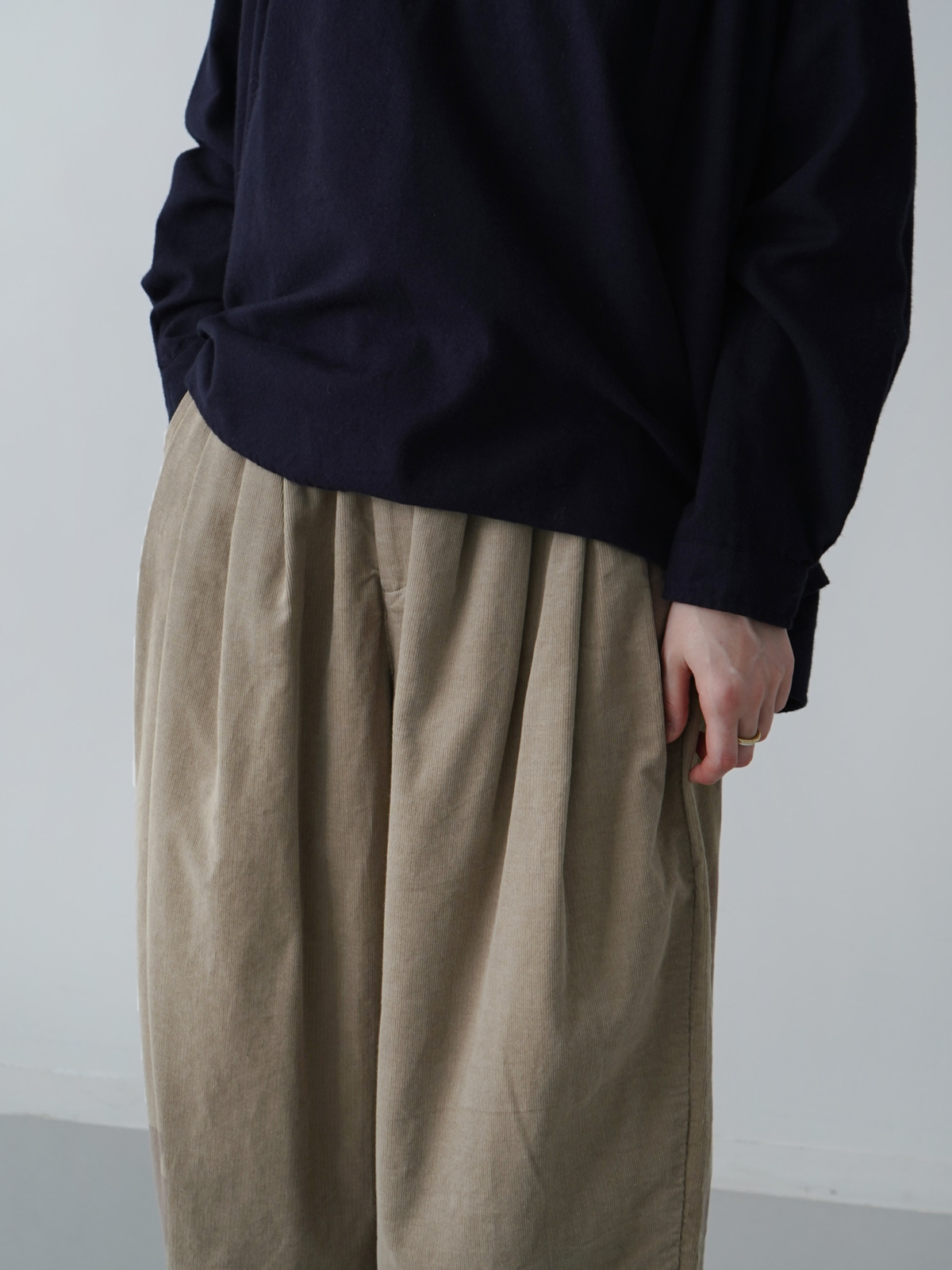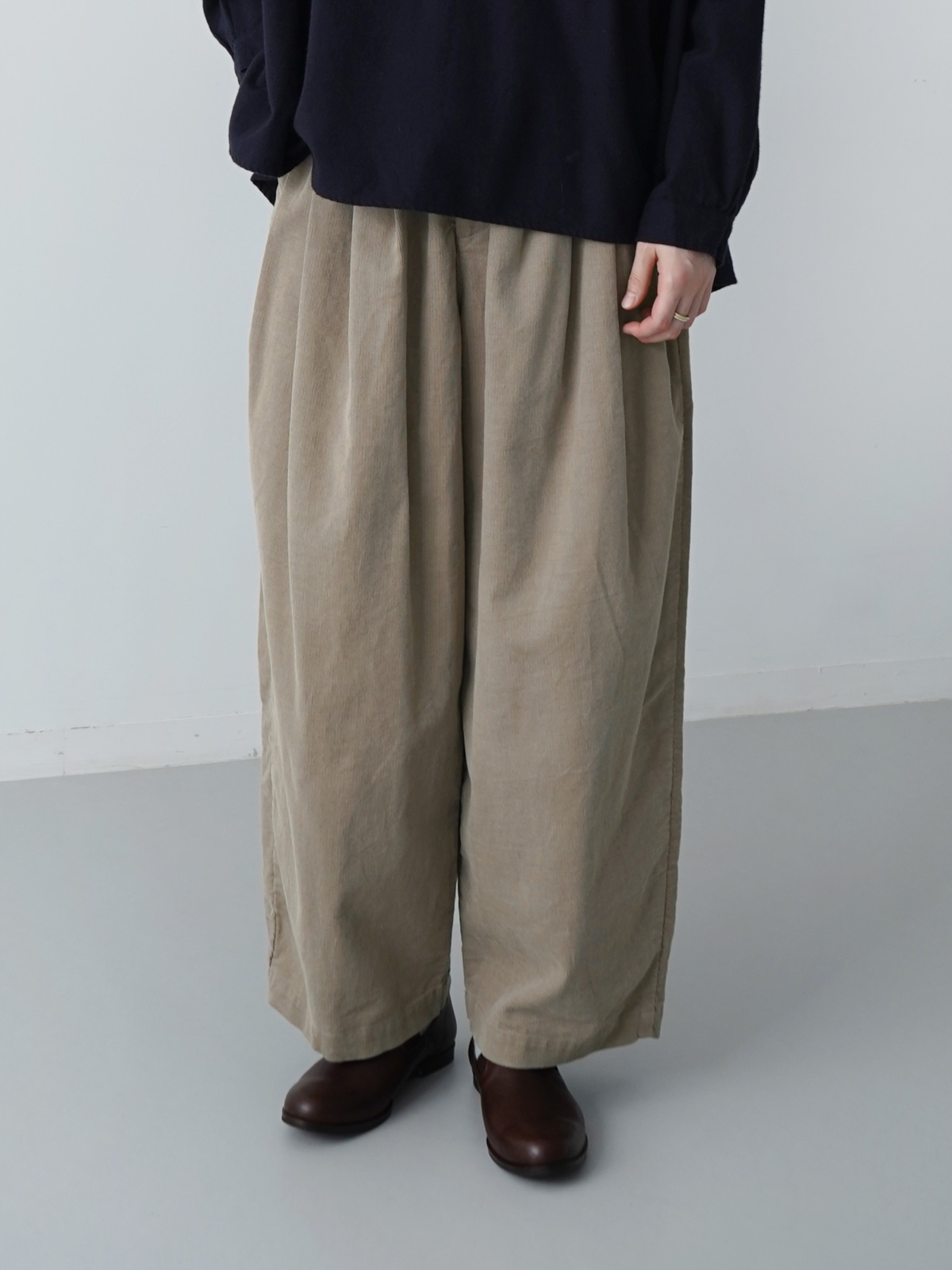 足長効果と大人っぽさが一番の押しポイントです。しっかりと丈が欲しいならこちらのコーデュロイ。太もも〜裾まで全体にワイドなのですが、今回のボトムの中で、足まわりに一番空間を感じるゆったりさでした。かなり楽ちんな穿き心地なのに、お腹まわりがすっきと見えるのがとても良かったです。インしたり、コンパクトなトップスも着る方はハンサムな印象で着れそうです。ニュアンスカラーがgrinらしい色展開です。