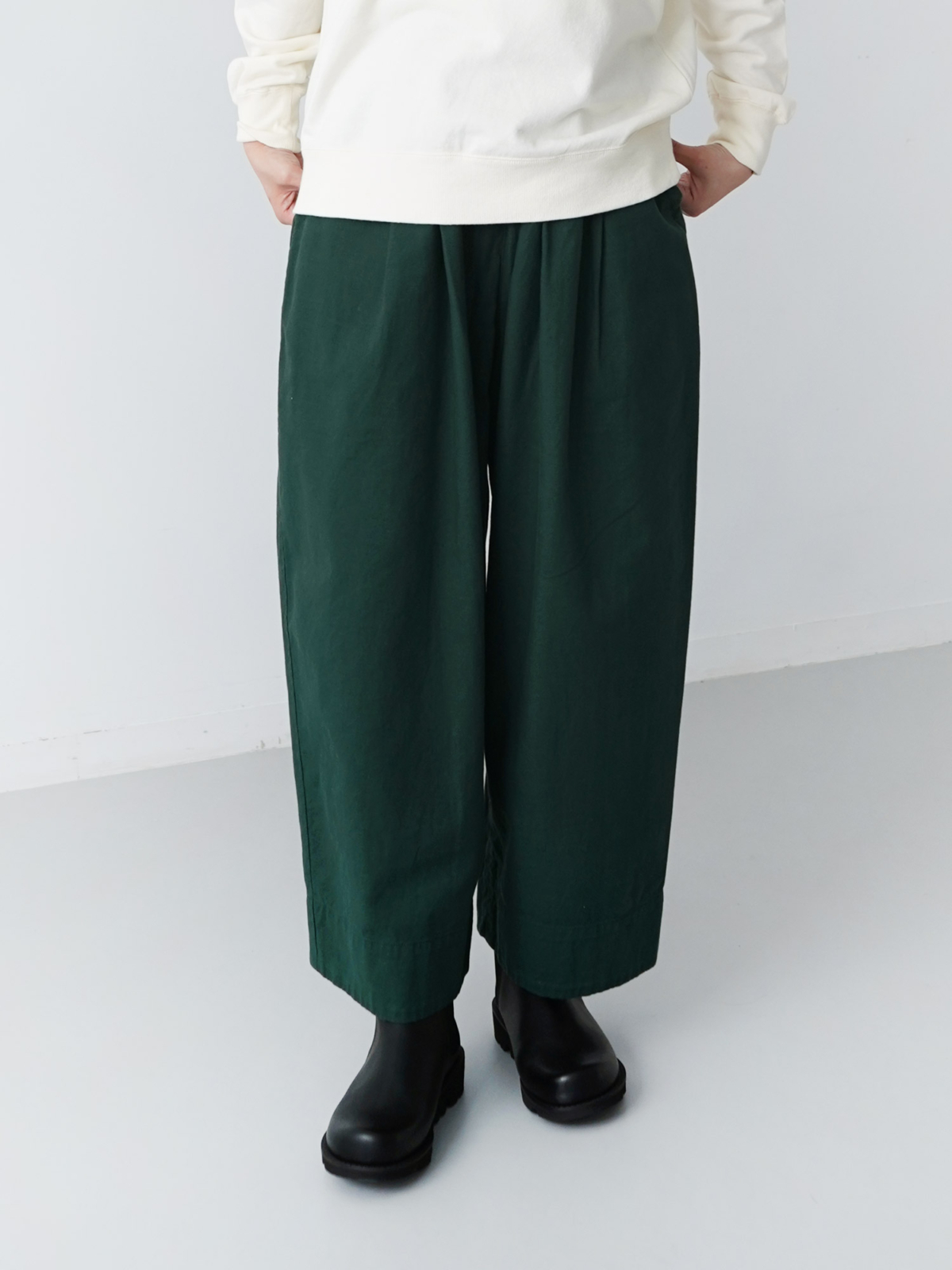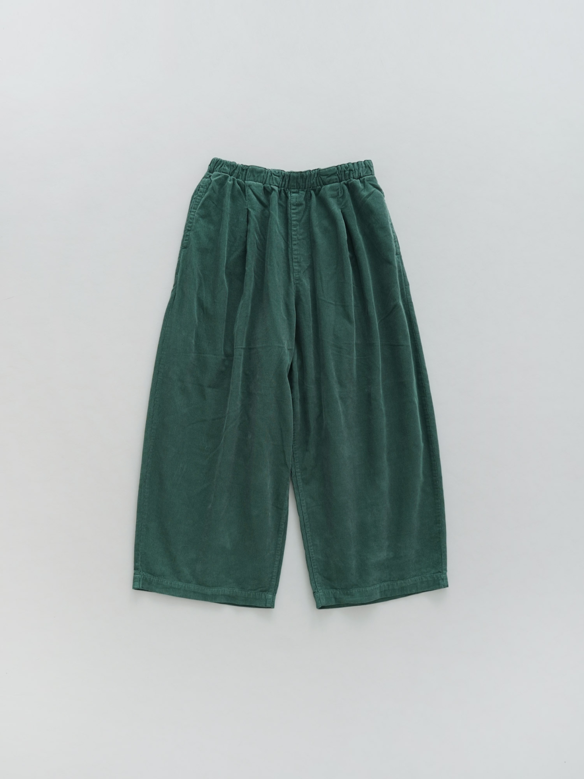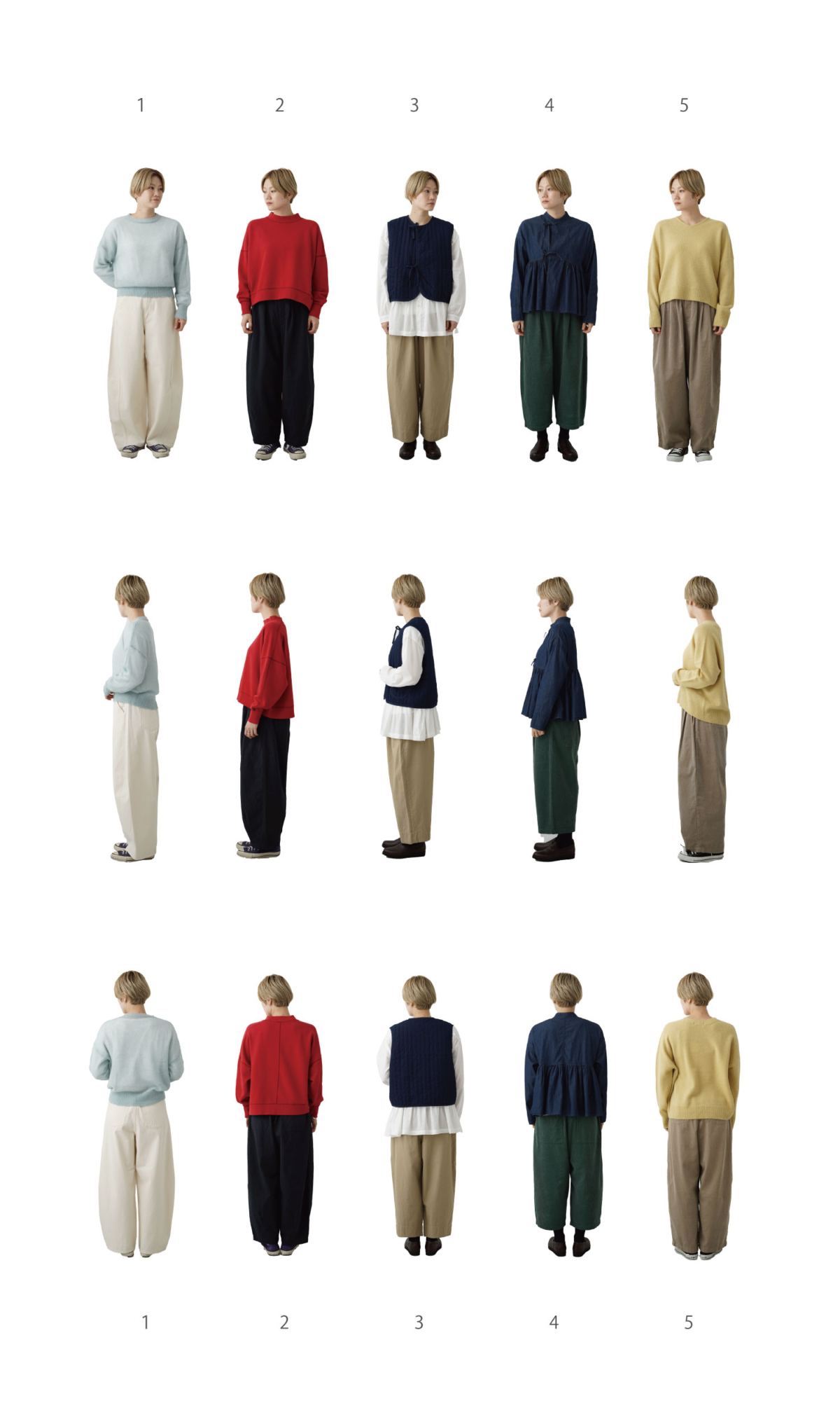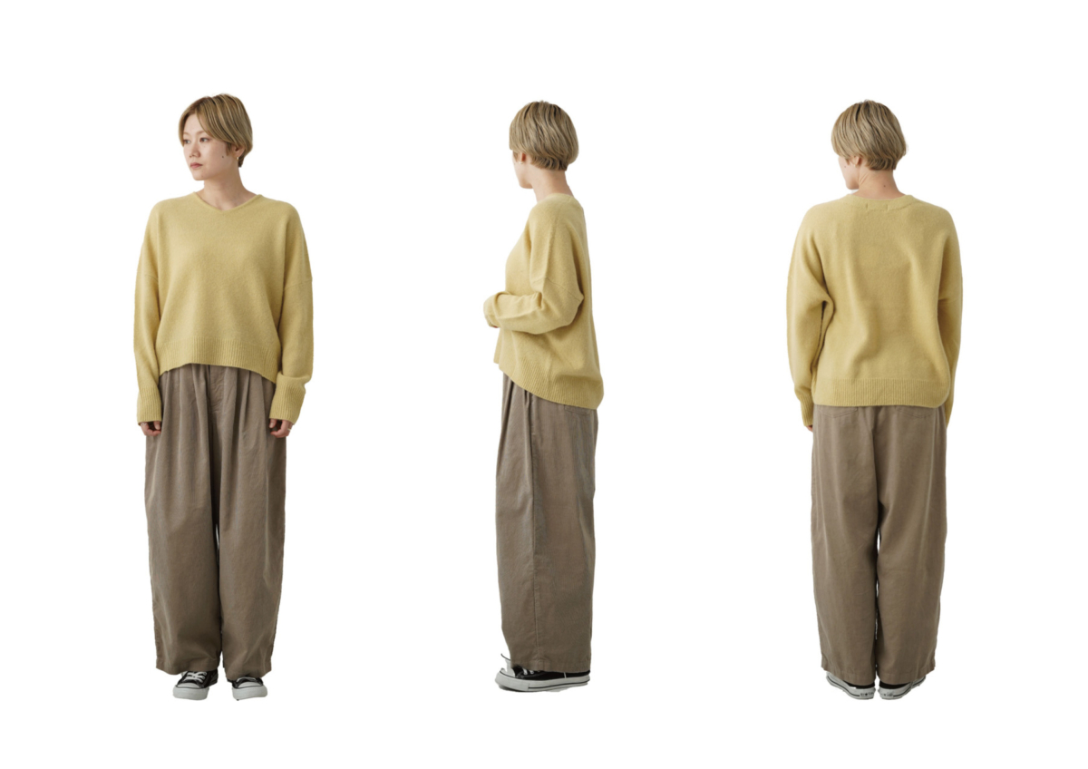 足長効果と大人っぽさが一番の押しポイントです。しっかりと丈が欲しいならこちらのコーデュロイ。太もも〜裾まで全体にワイドなのですが、今回のボトムの中で、足まわりに一番空間を感じるゆったりさでした。かなり楽ちんな穿き心地なのに、お腹まわりがすっきと見えるのがとても良かったです。インしたり、コンパクトなトップスも着る方はハンサムな印象で着れそうです。ニュアンスカラーがgrinらしい色展開です。