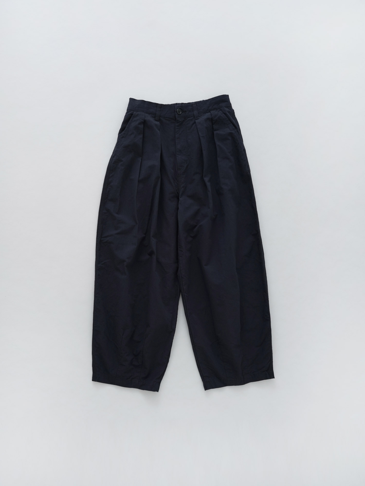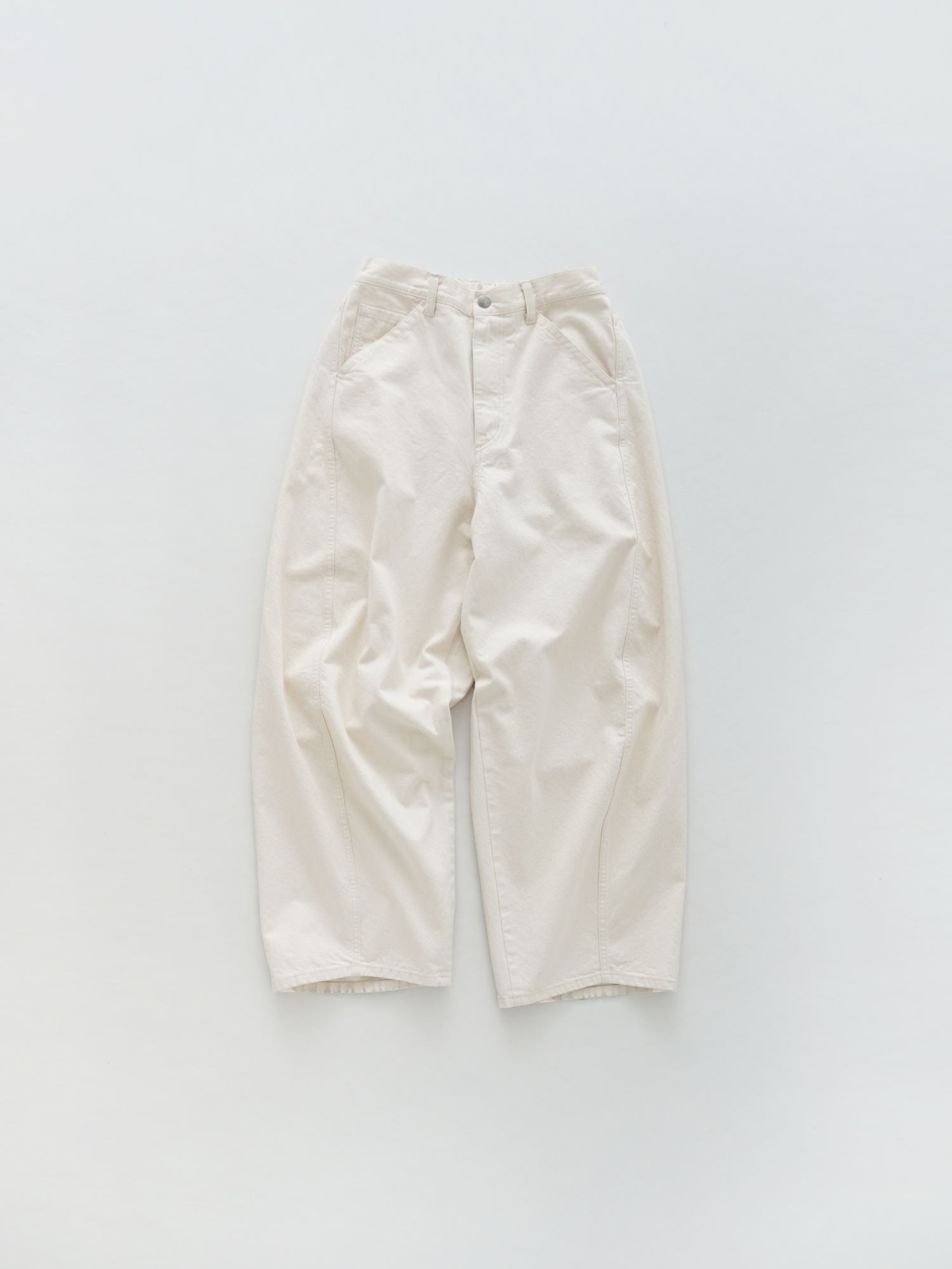 緩やかにカーブを描いた絶妙な丸みのあるパンツ。裾のダーツにより立体感が出て、ワイドでも広がり過ぎないシルエットに。穿き心地はゆったりと。