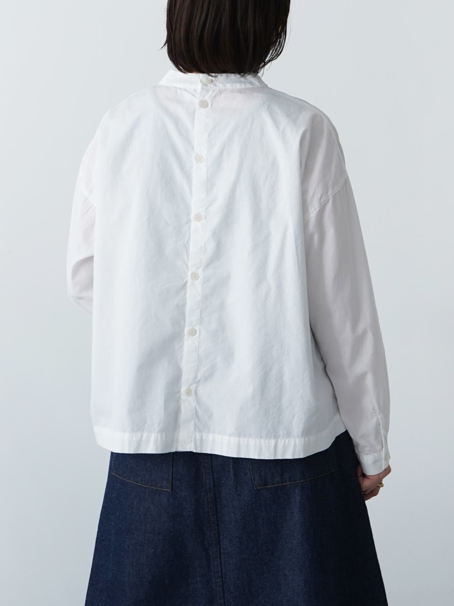 少し高さを持たせた襟ぐりが上品なシャツ、