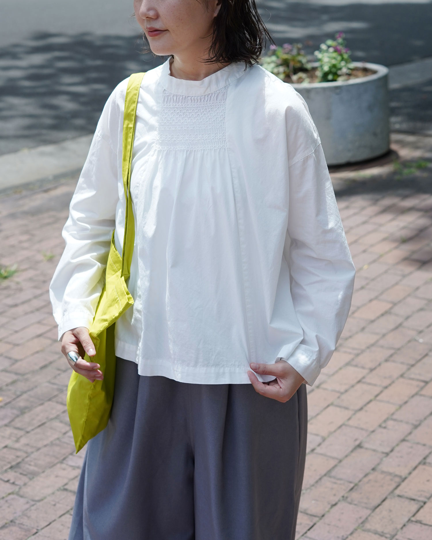少し高さを持たせた襟ぐりが上品なシャツ、