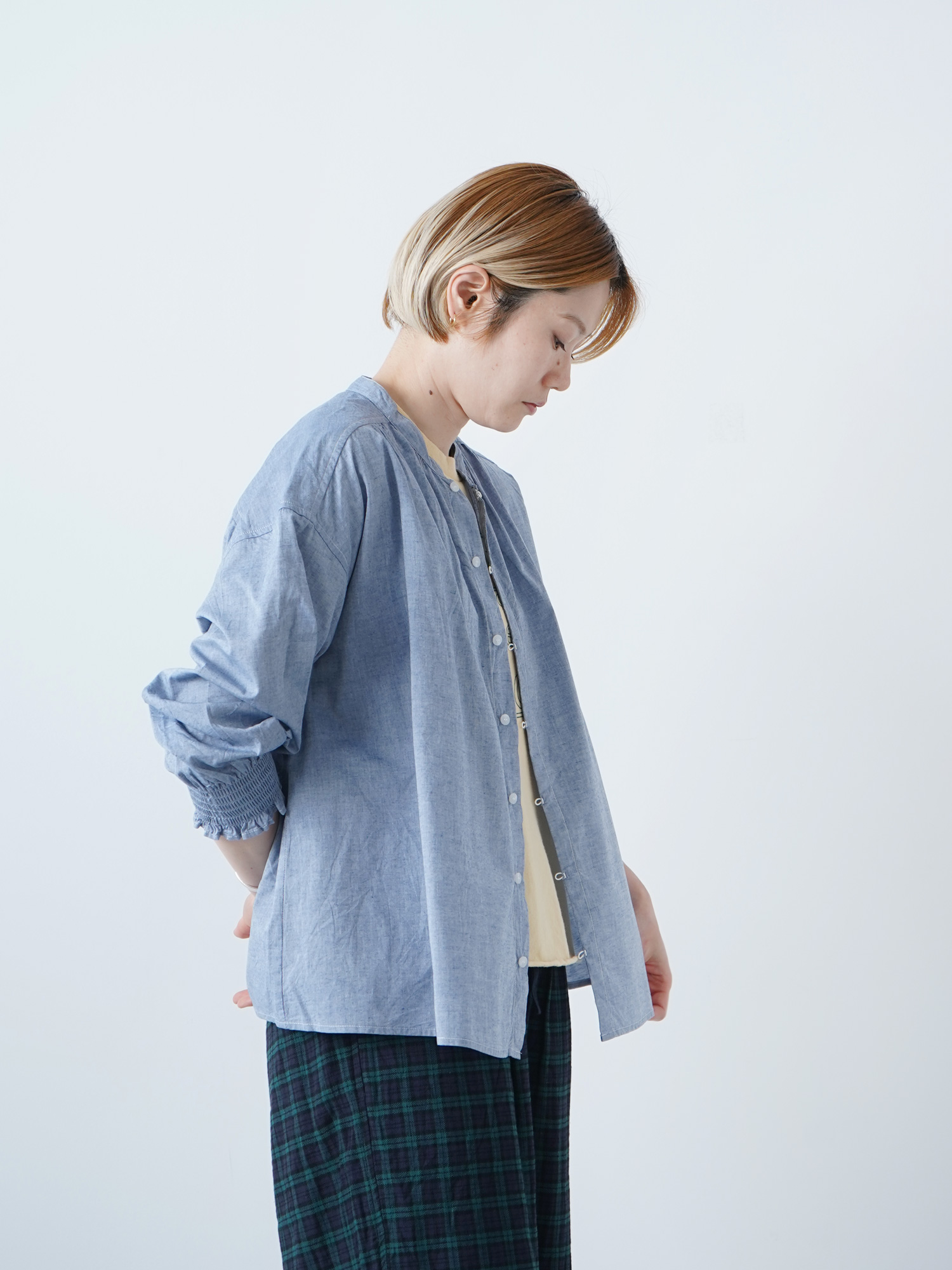 コーマシャンブレー 袖シャーリングシャツ¥15400-