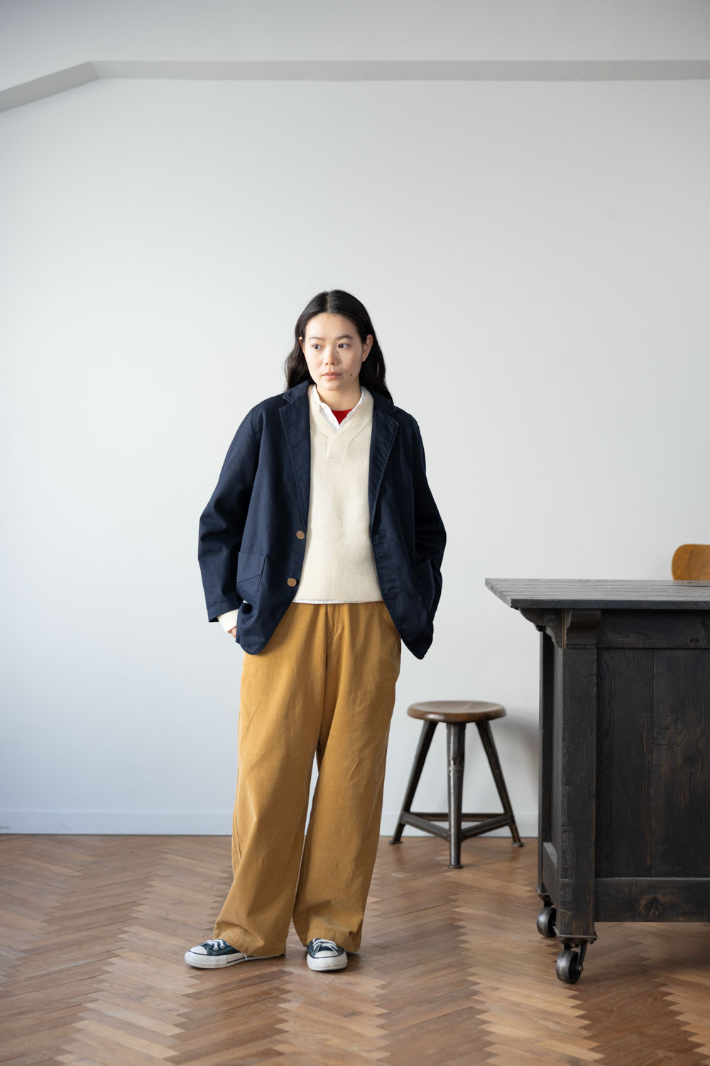 ブレザーやジャケットに、デニム。シャツにYネックのプルオーバー。