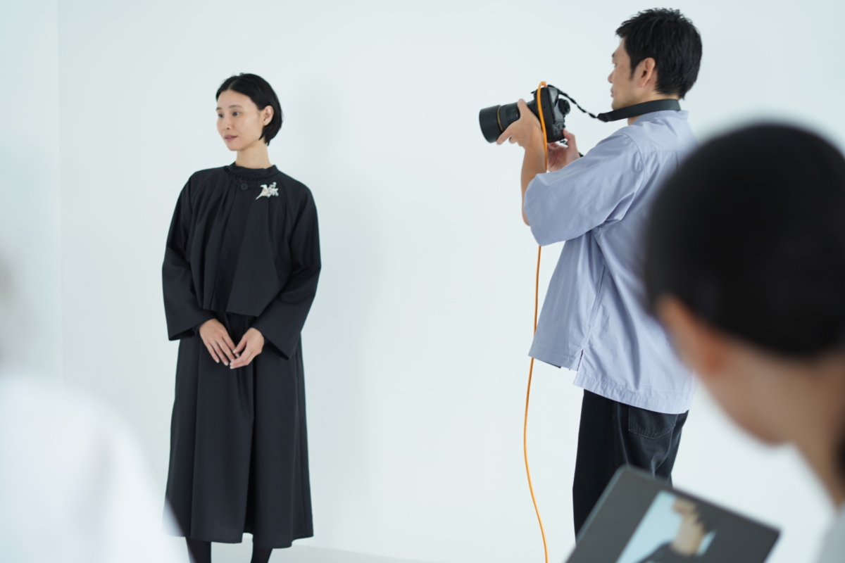 撮影が始まると静かなシャター音とモデルのmacoさんとのピッタリな息に、ここでしか味わえない心地よい緊張感を感じます。テーマとなっている “ fog “ を表現していくためにチーム一丸となる瞬間です。