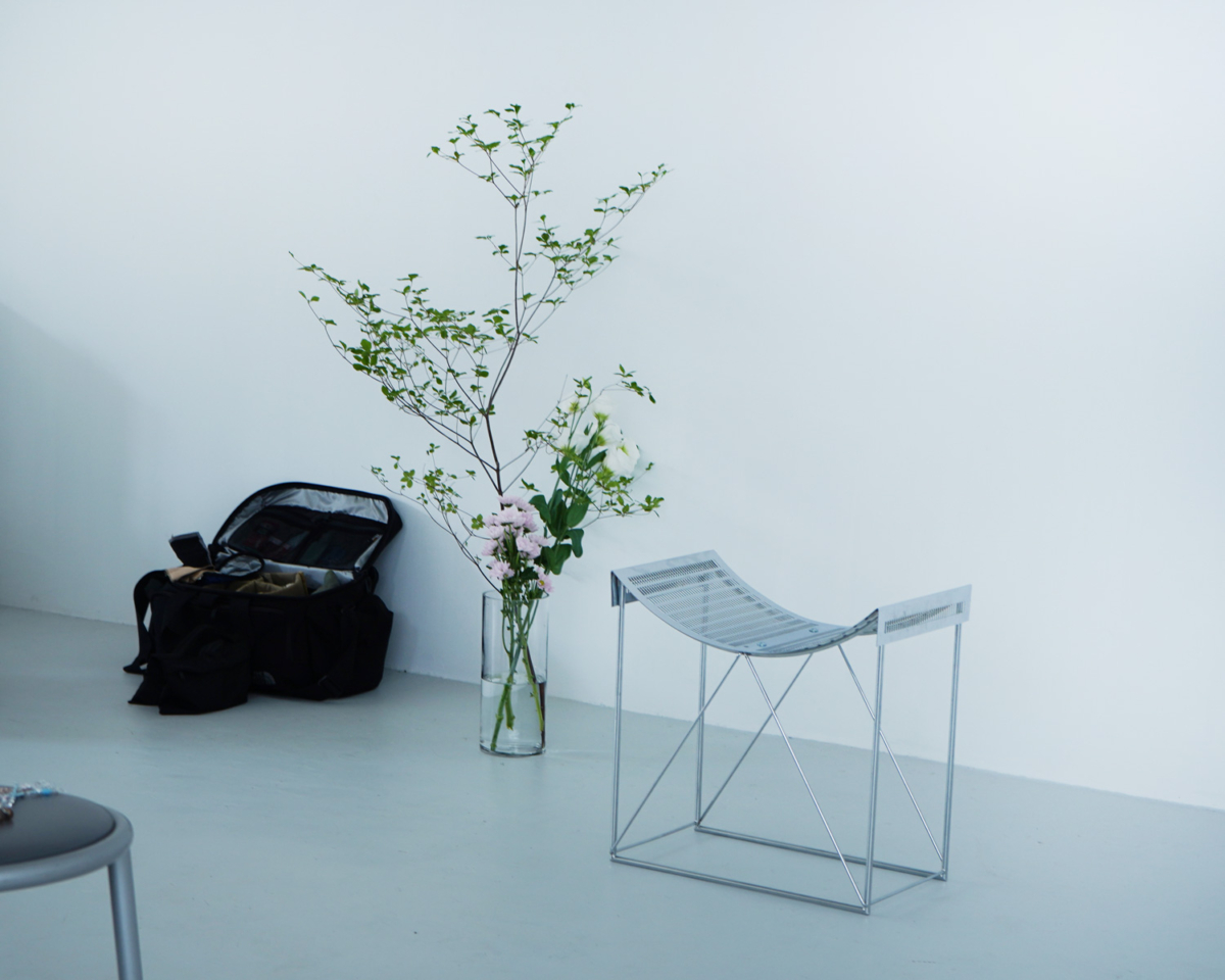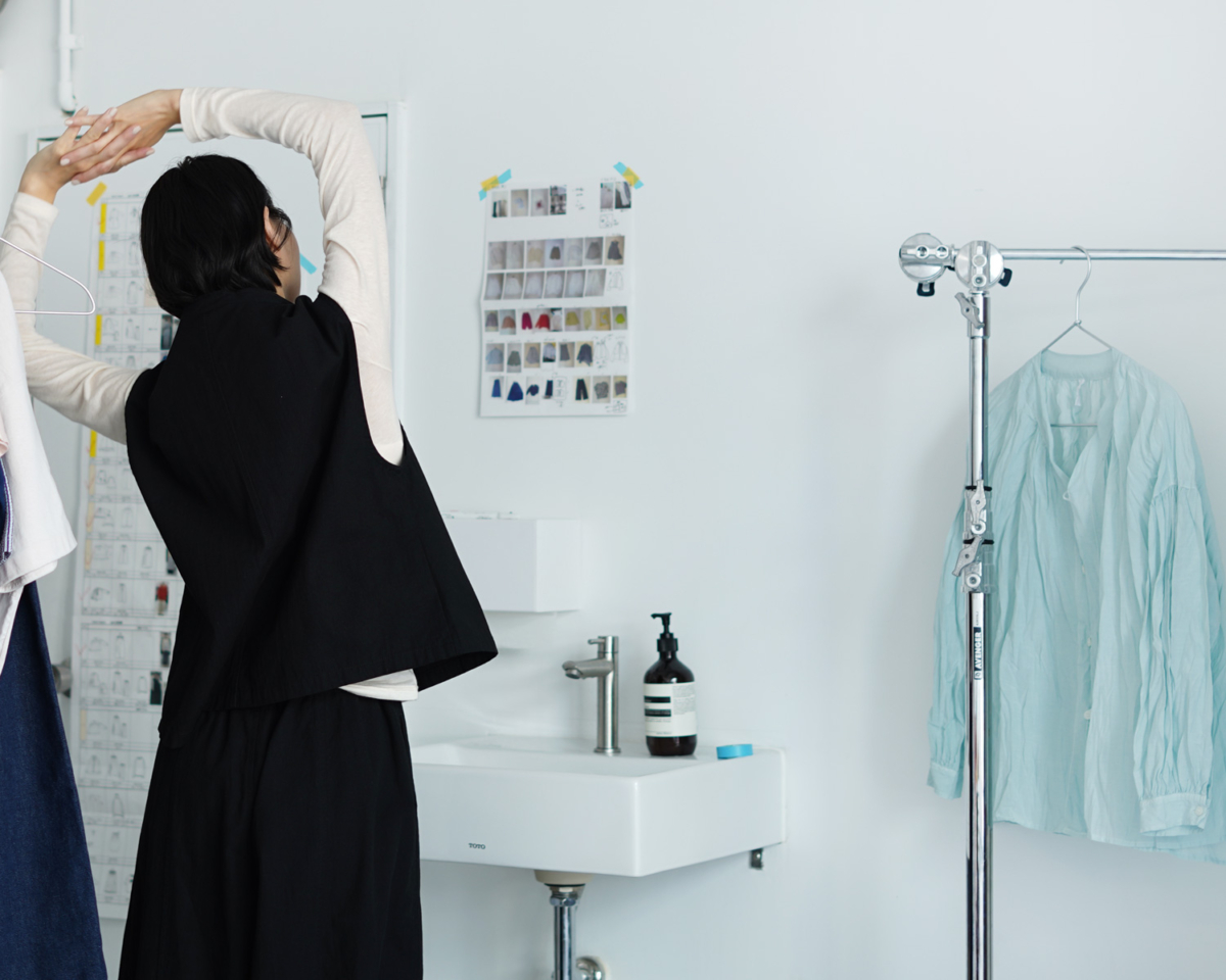 白が基調となったスタジオは、柔らかな朝の日差しが部屋全体にまわり、パッと目が覚めるような一室。生地の風合いやきれいな色、テキスタイルなど服そのものが立ってくる空間です。