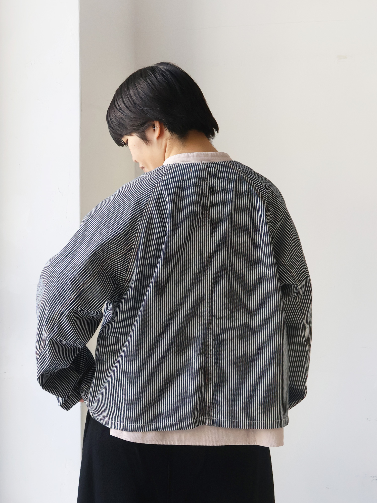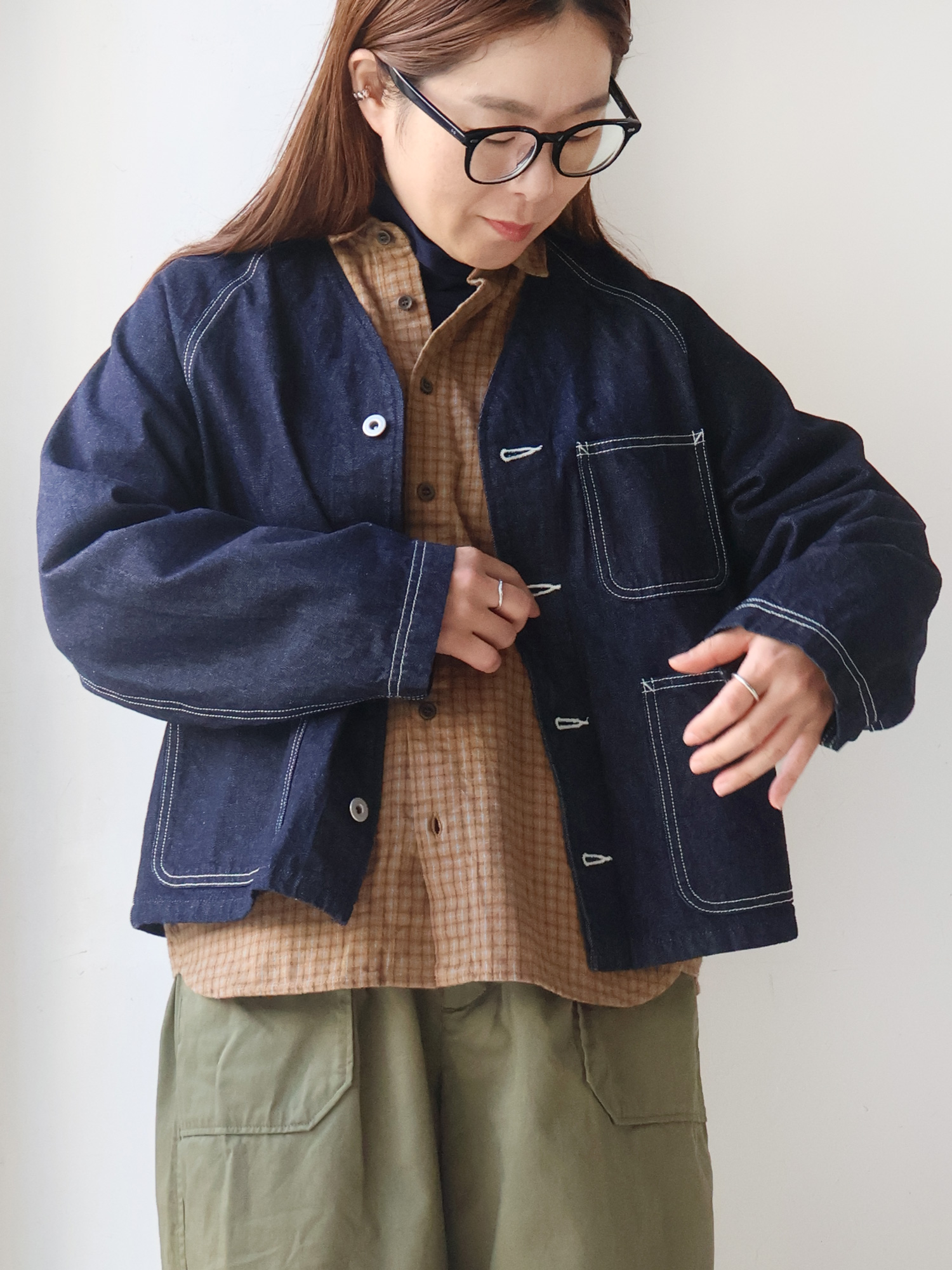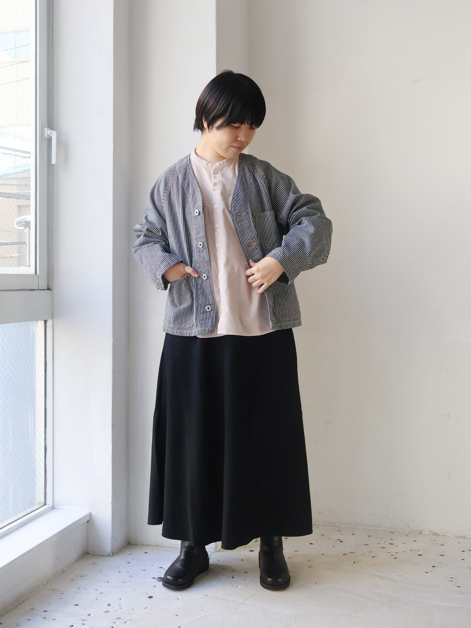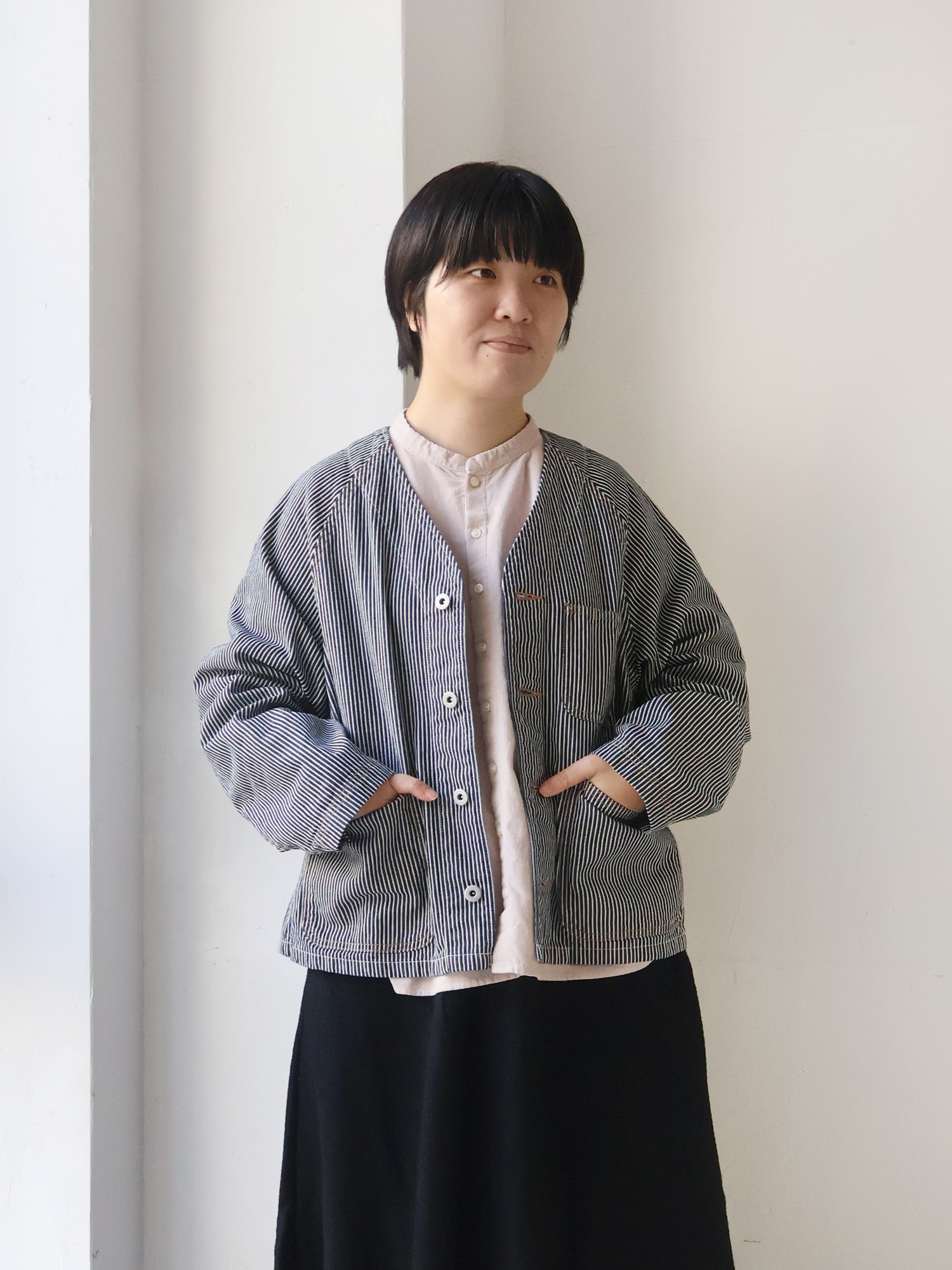 ヒッコリーデニムジャケットのゆったり具合とネックラインを活かして、