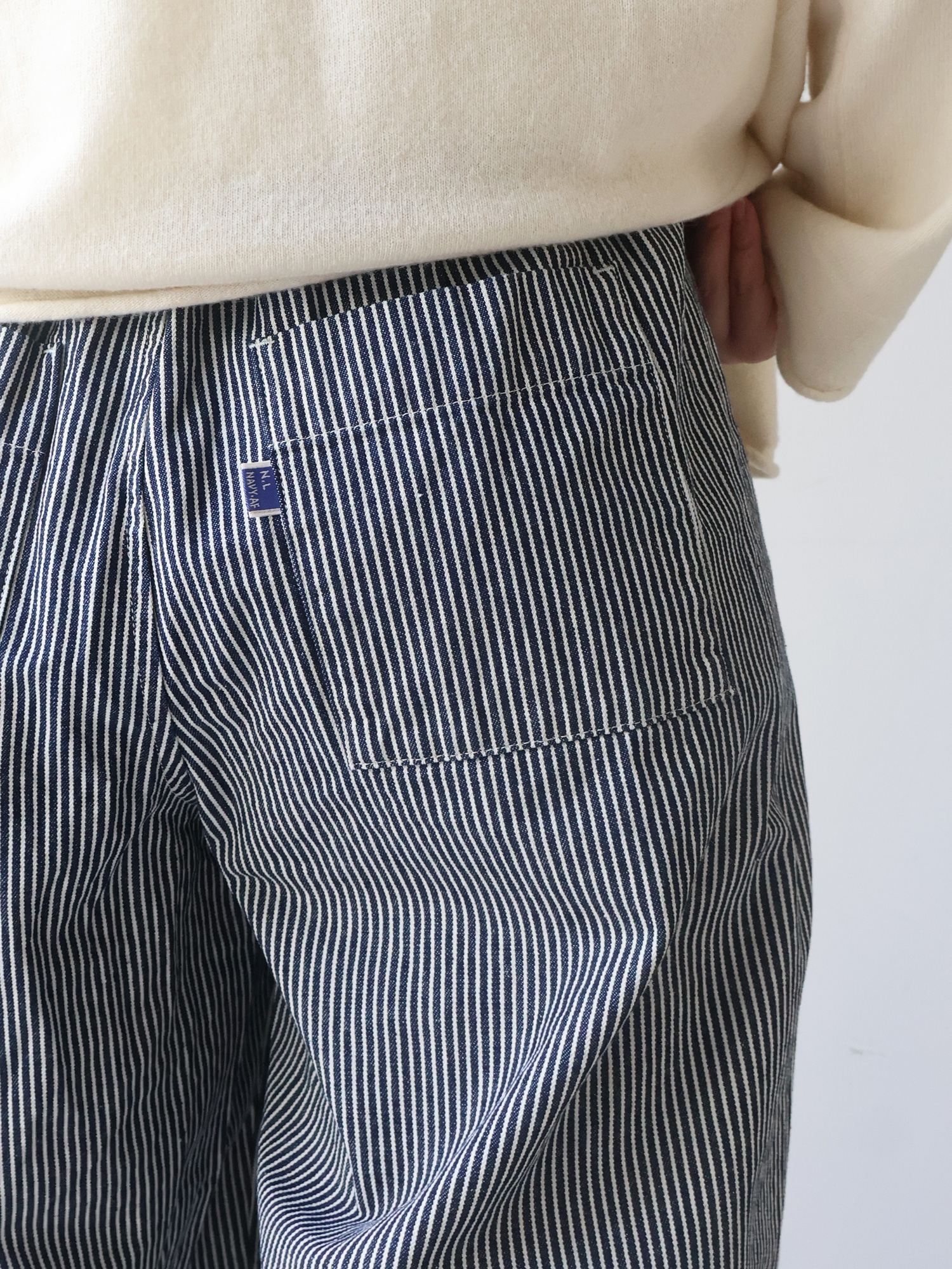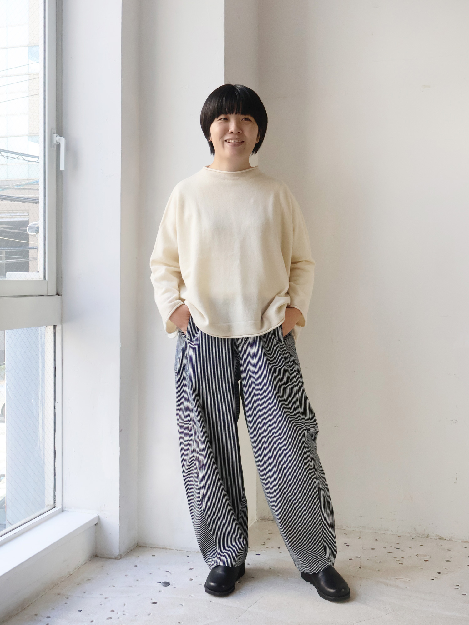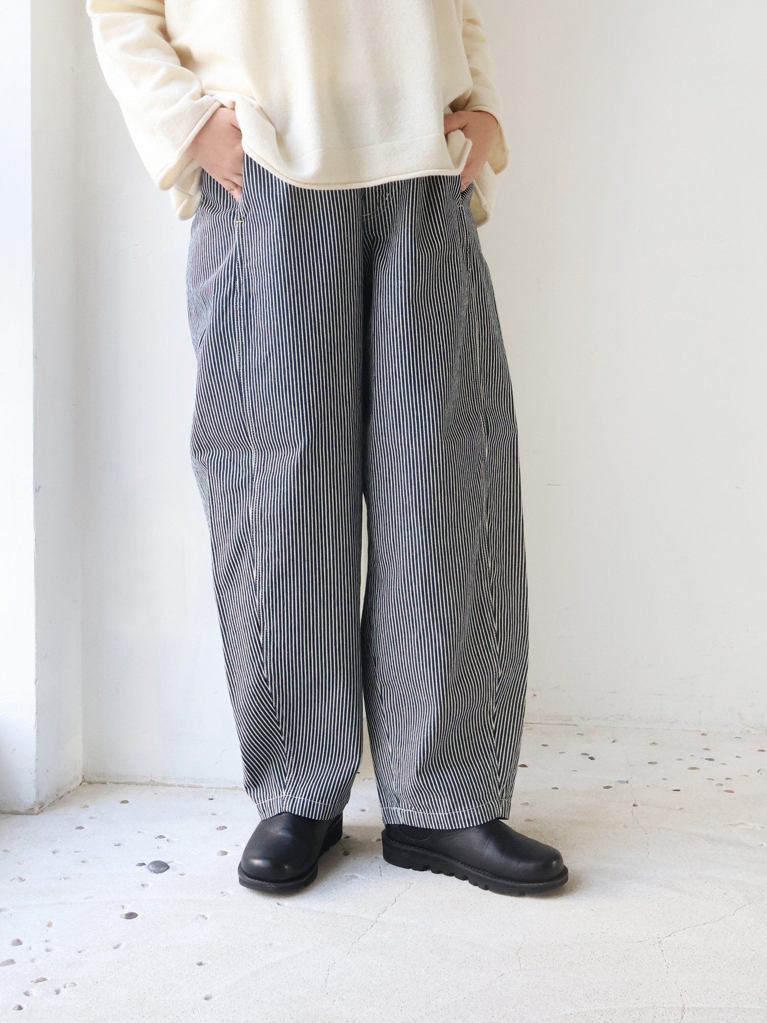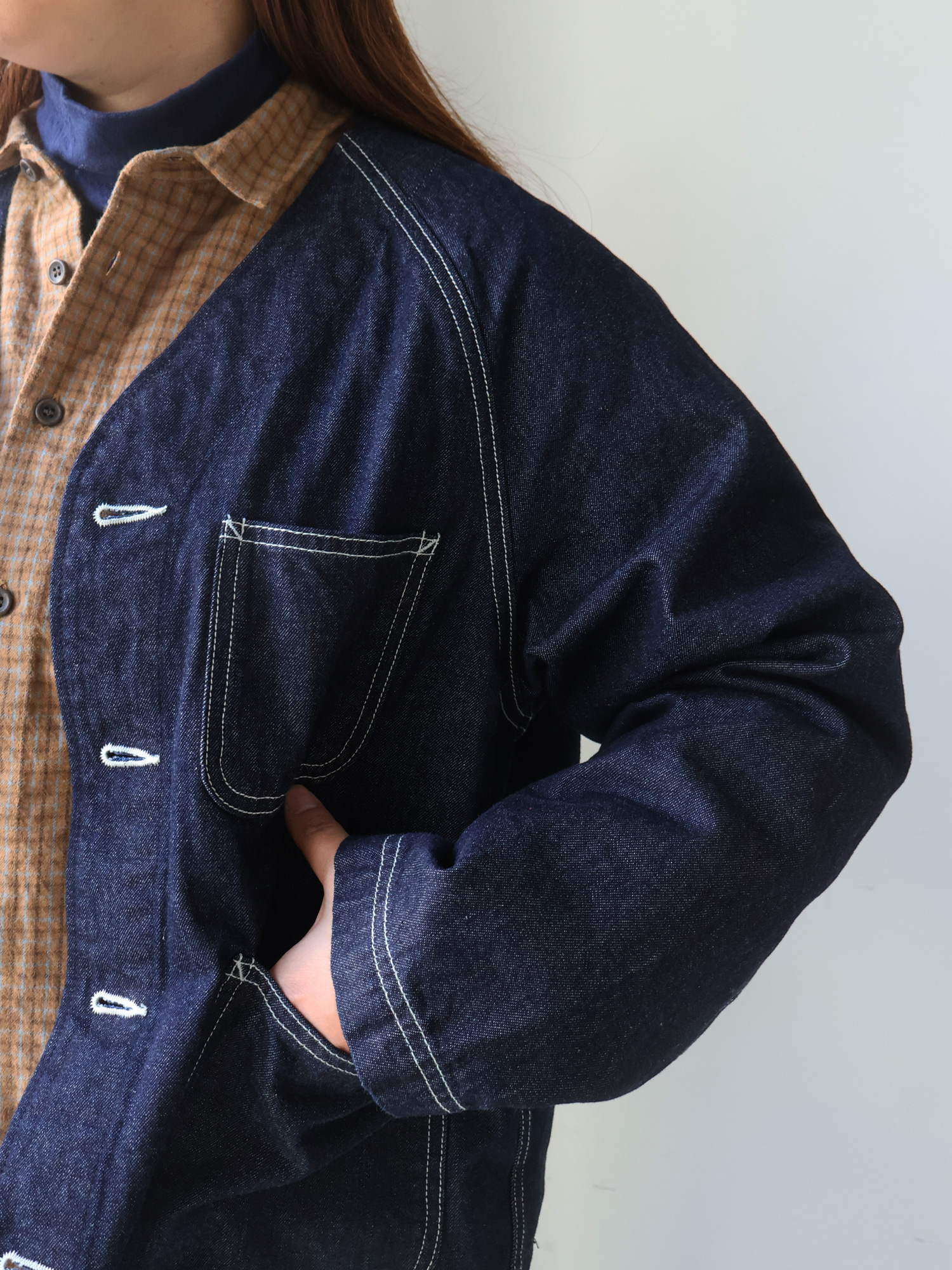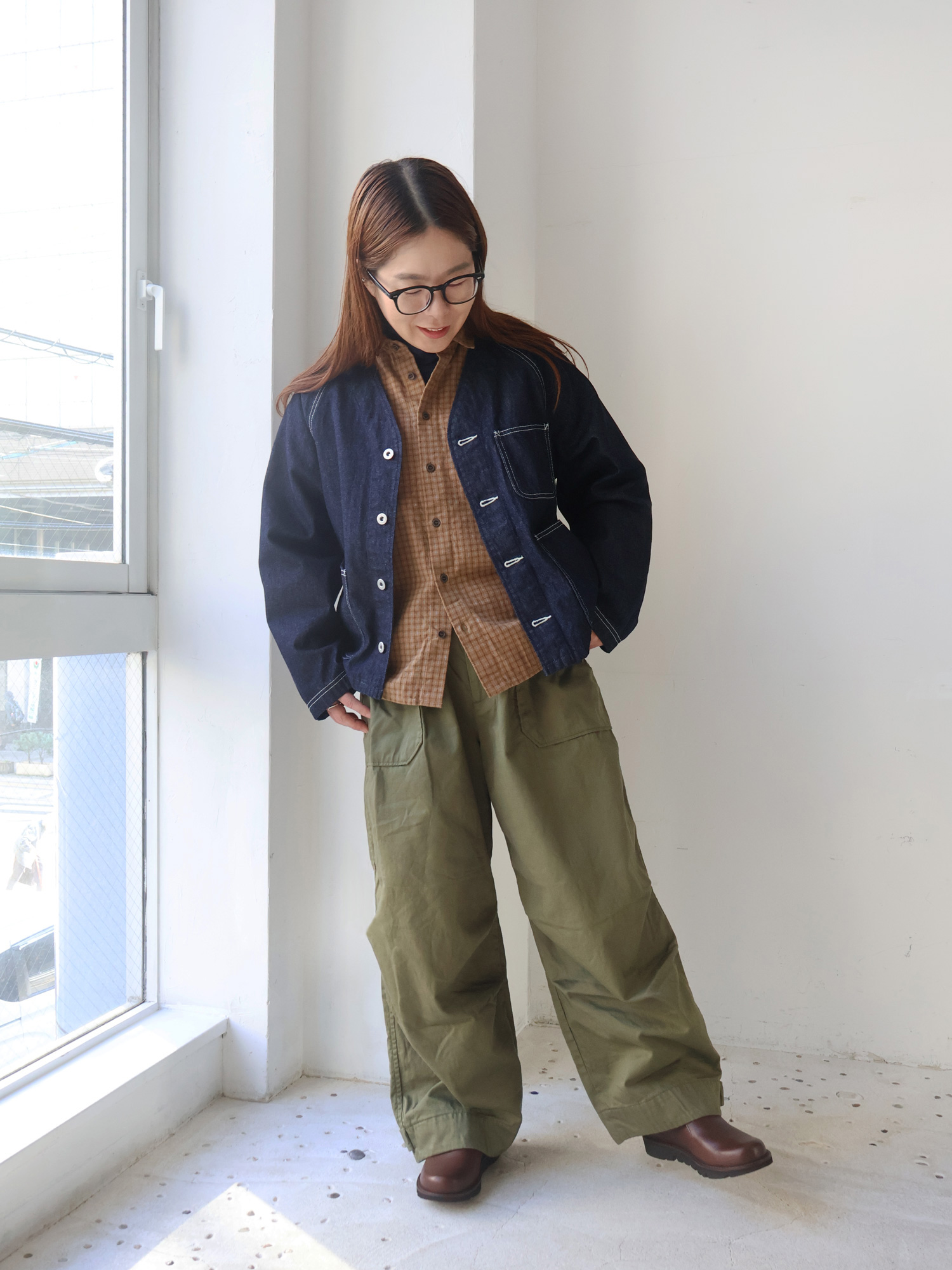 ヒッコリーデニムジャケットのゆったり具合とネックラインを活かして、
