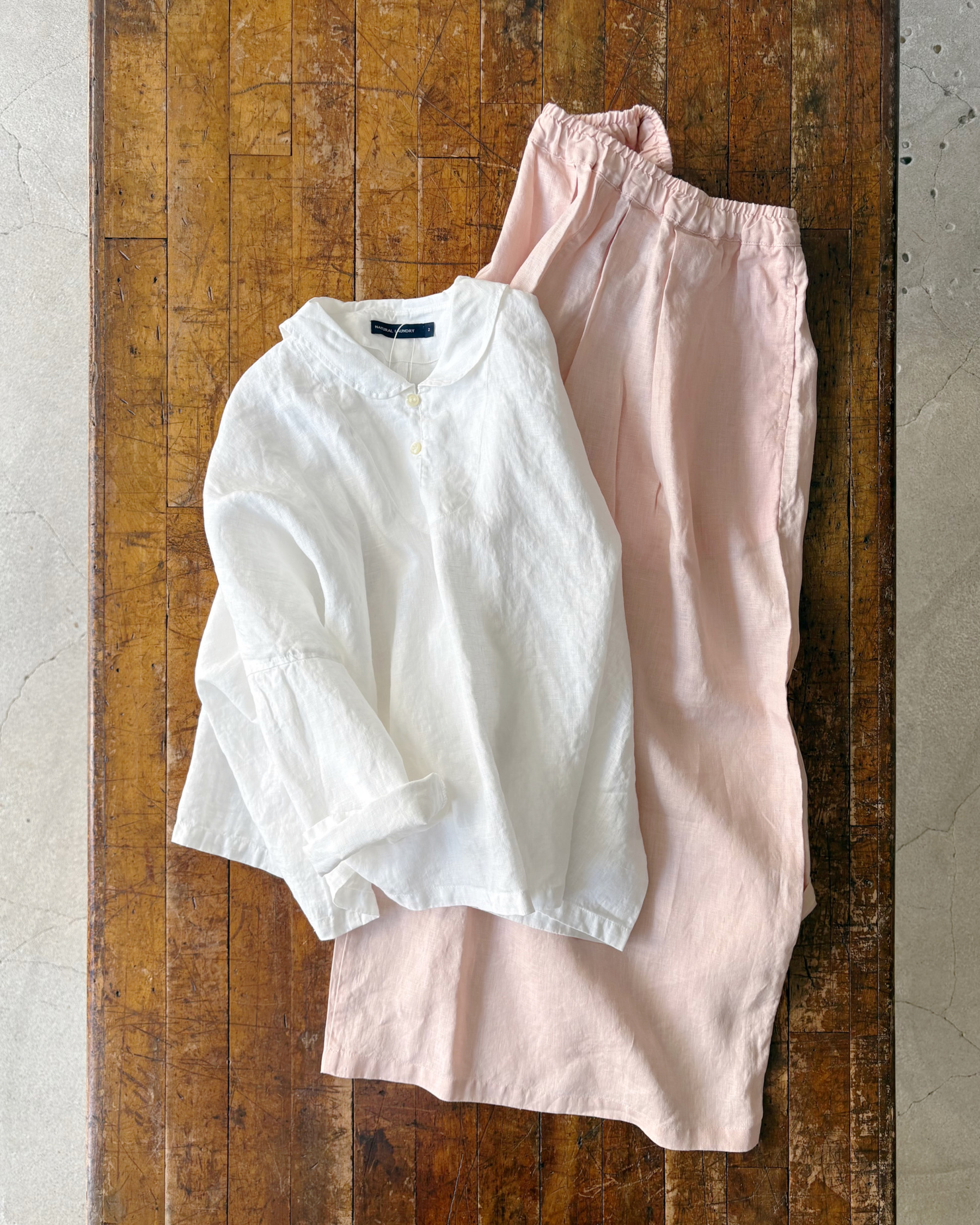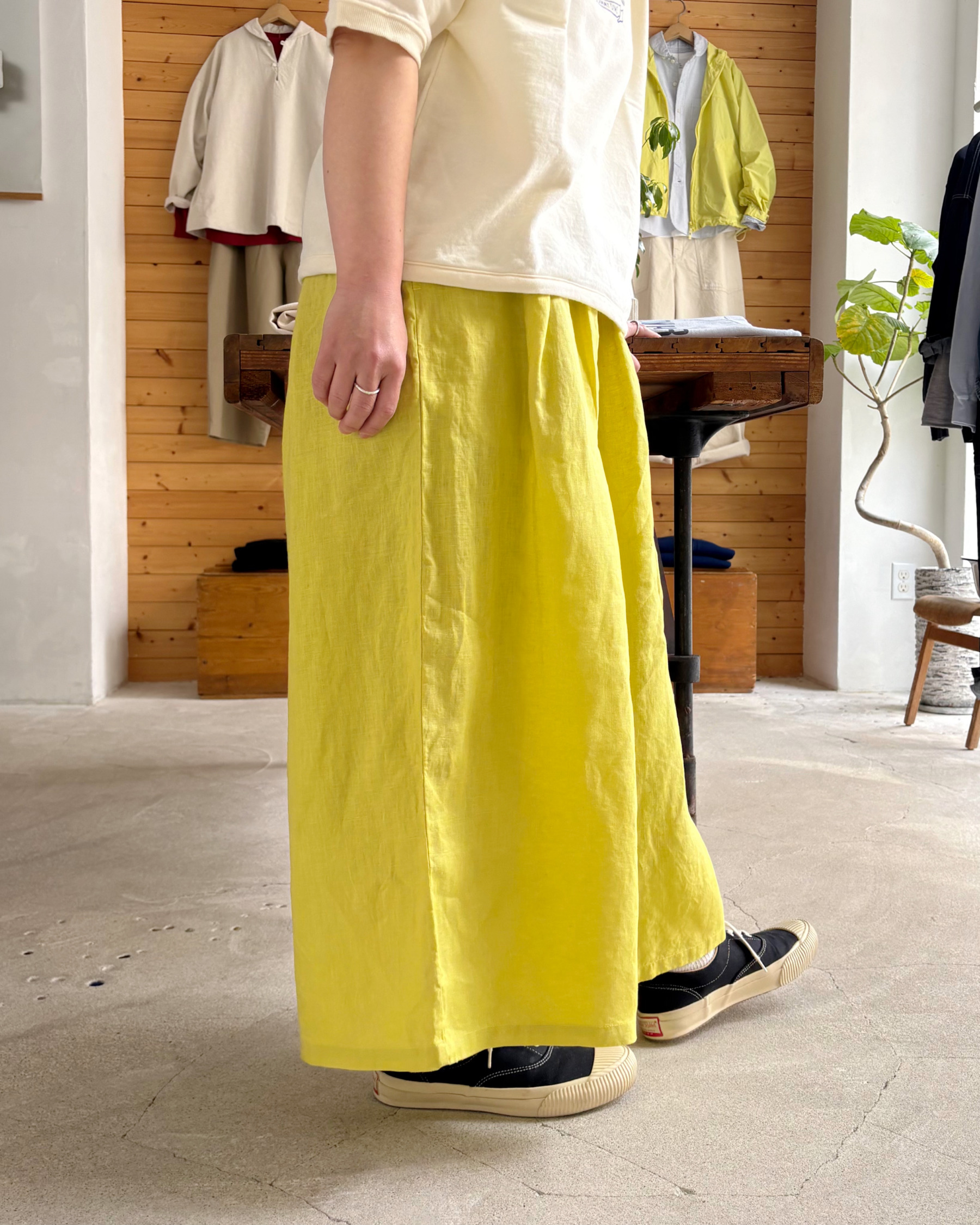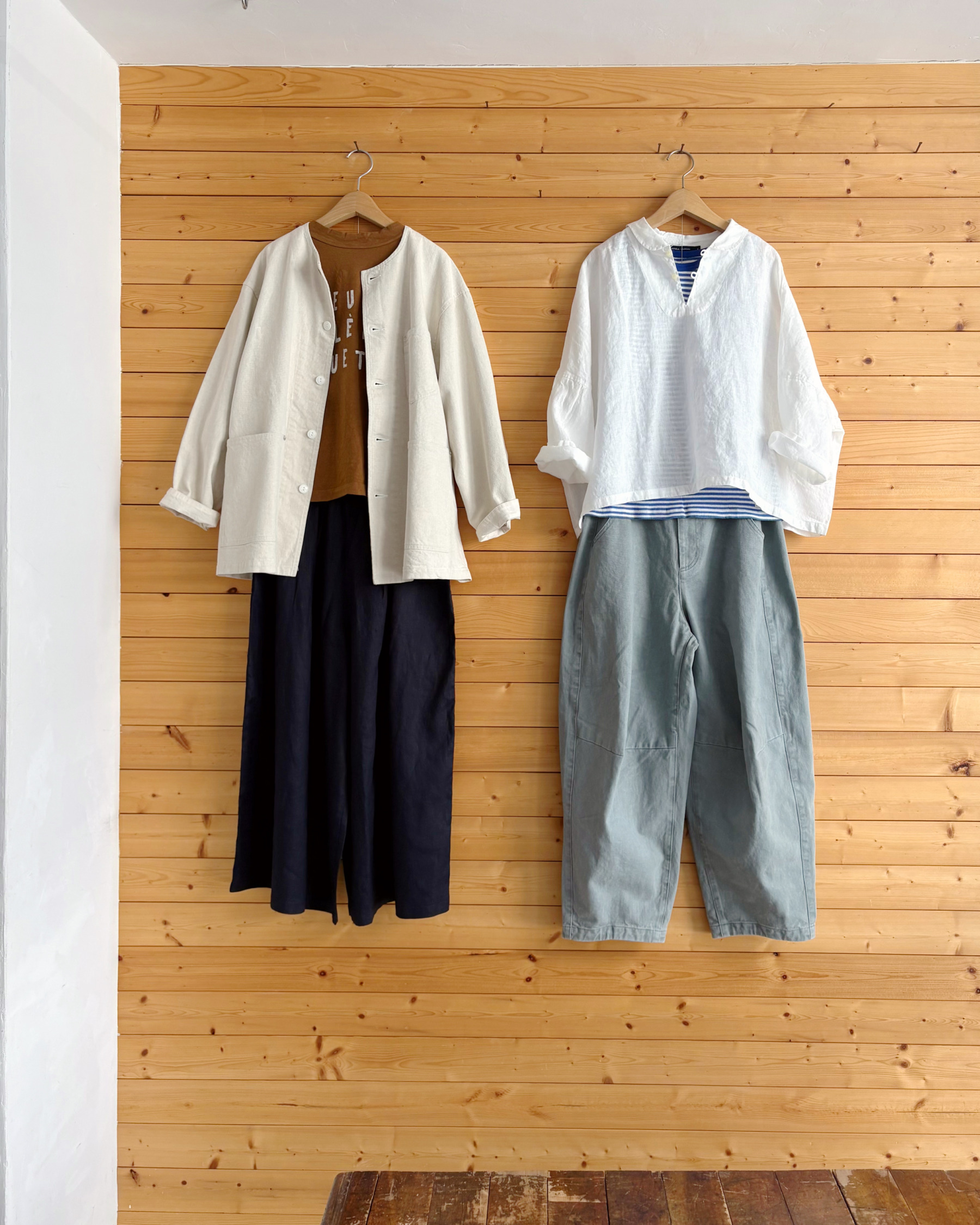 シーズンルックからもお問合せの多い、軽やかなリネンのシャツとパンツもお店に並びました。